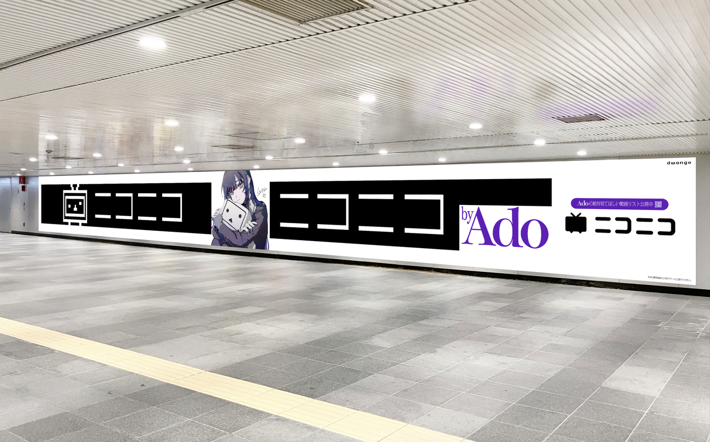 Adoがニコニコ動画の公式キャラクターであるテレビちゃんを抱きかかえる描き下ろしイラストが描かれた巨大交通広告が、3月18日より、渋谷、新宿、秋葉原、池袋の4駅で掲出。「なんだかんだ、ニコニコが好き」というキャッチコピーと併せて、Ado本人から寄せられたメッセージも掲載。プリントされたAdoのサインと手書きで描いたテレビちゃんのイラストにも注目しよう。