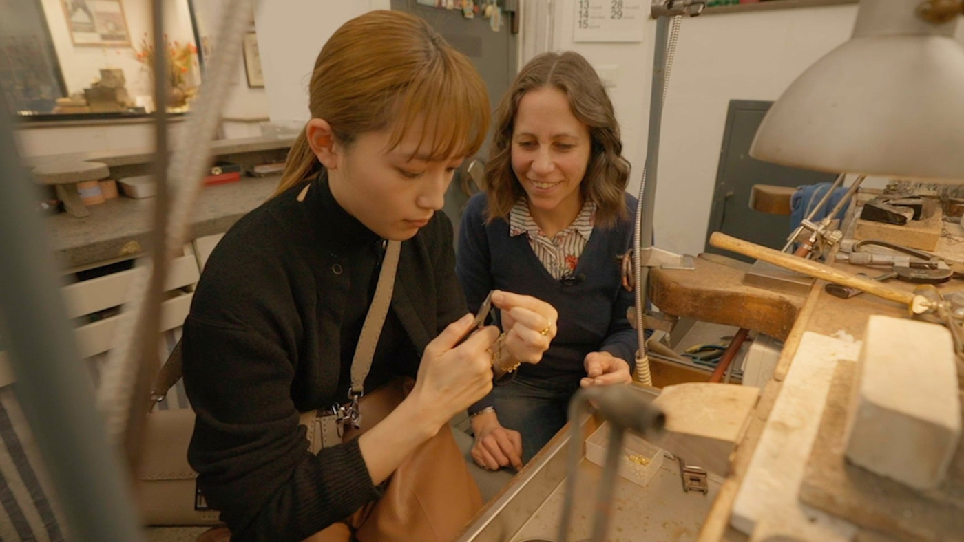 川口はミラノで『VOGUEイタリア』の編集長と対談。イタリアファッションの魅力を聞く。ローマでは、古代ローマ時代から残る装飾品を使って、アクセサリー工房で次の世代へと受け継ぐ職人たちの精神性に刺激を受ける。