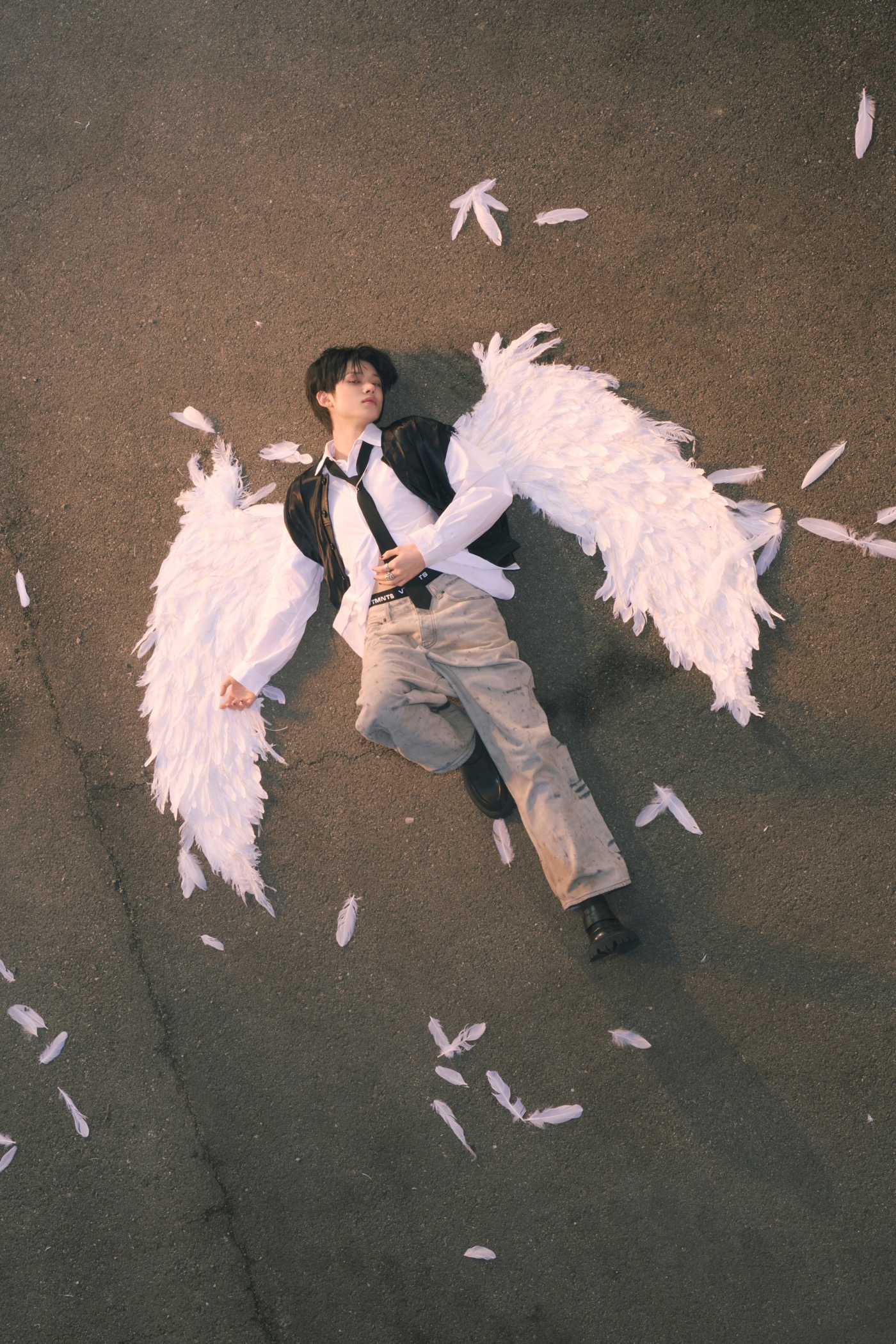 緩いタイとダメージのある衣装、武骨なアクセサリーを着用した5人のメンバーは、反抗的なロックスターのような雰囲気。ギターのピックを口にしたSOOBINとBEOMGYUのオーラが目を引く。YEONJUNの後ろに広がる翼、TAEHYUNとHUENINGKAIが持っている翼型のギターなど、上昇のニュアンスを持ったアイテムである「翼」とまっすぐ長く伸びた道路は、前に進むという意志を暗示している。