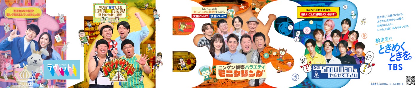 TBSで毎週月~金曜8時から放送中の『ラヴィット!』、毎週火曜20時から放送中の『バナナサンド』、毎週木曜20時から放送中の『ニンゲン観察バラエティ モニタリング』、そして毎週金曜20時から放送中の『それSnow Manにやらせて下さい』の4番組が、「新生活に、ときめくときを。」と題し、新生活を迎えた人へ向けたメッセージ動画を公開した。