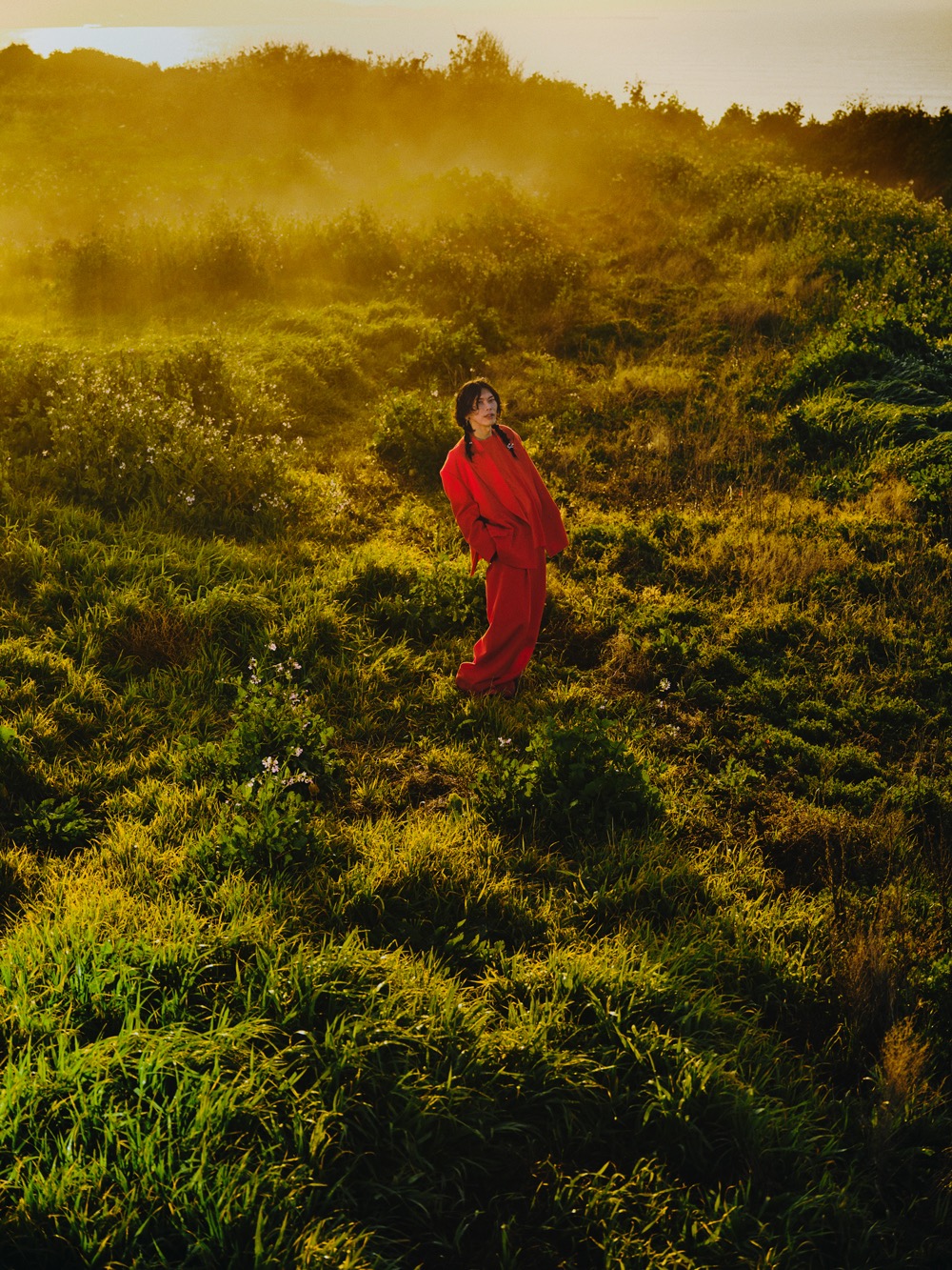 ■髪を三つ編みにした米津玄師が、柔らかな朝日に包まれ草原に立ちすくむ新ビジュアル