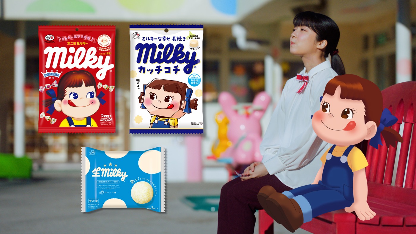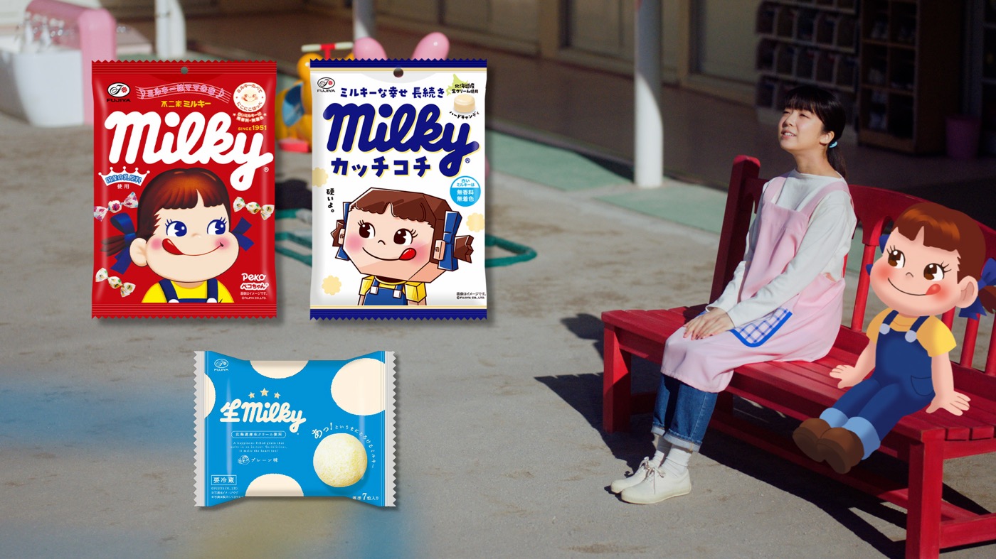 また、『ミルキーはそのまんま』篇では、ミルキーそのもののシンプルな甘さを味わいながら、保育園の外のベンチでひと息休憩する上白石萌音のほのぼのとしたシーンが描かれる。
