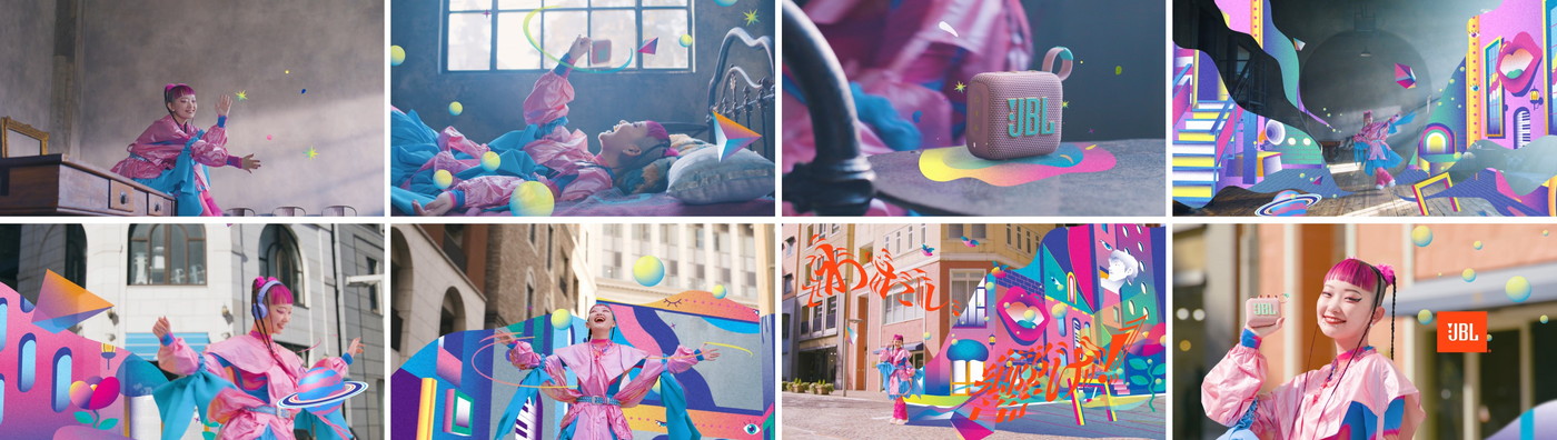 色も形も様々なグラフィックが、枠に囚われない自由で独創的な発想をイメージ。“音楽”を聴くだけの受け身的なものではなく、自分を“解き放ち”、“自分らしく発信していく”ための、能動的なアクションを引き起こすきっかけのひとつとして捉えた今回のキャンペーンのメッセージを、JBL のスピーカーと詩羽を通して届けている。