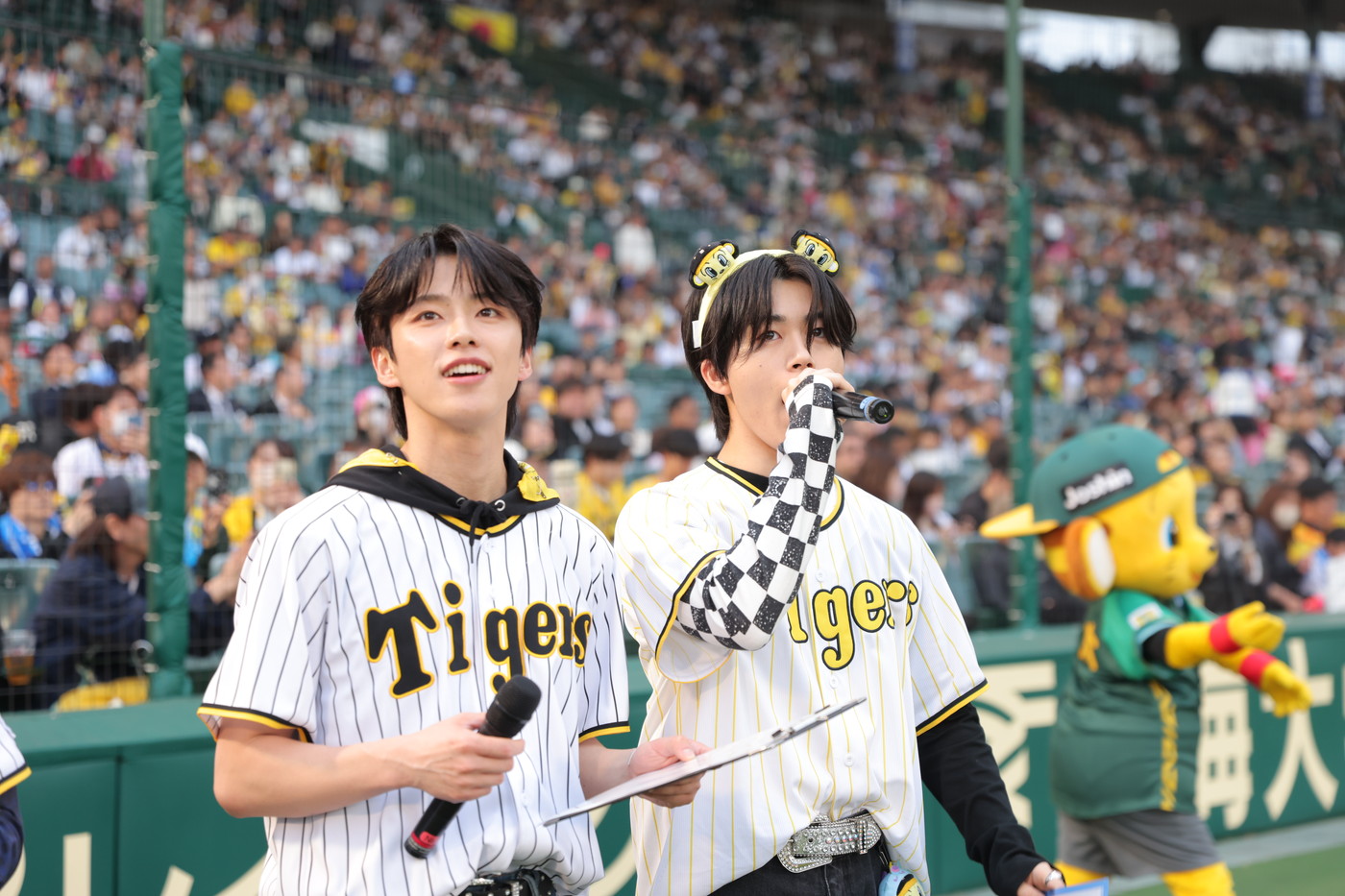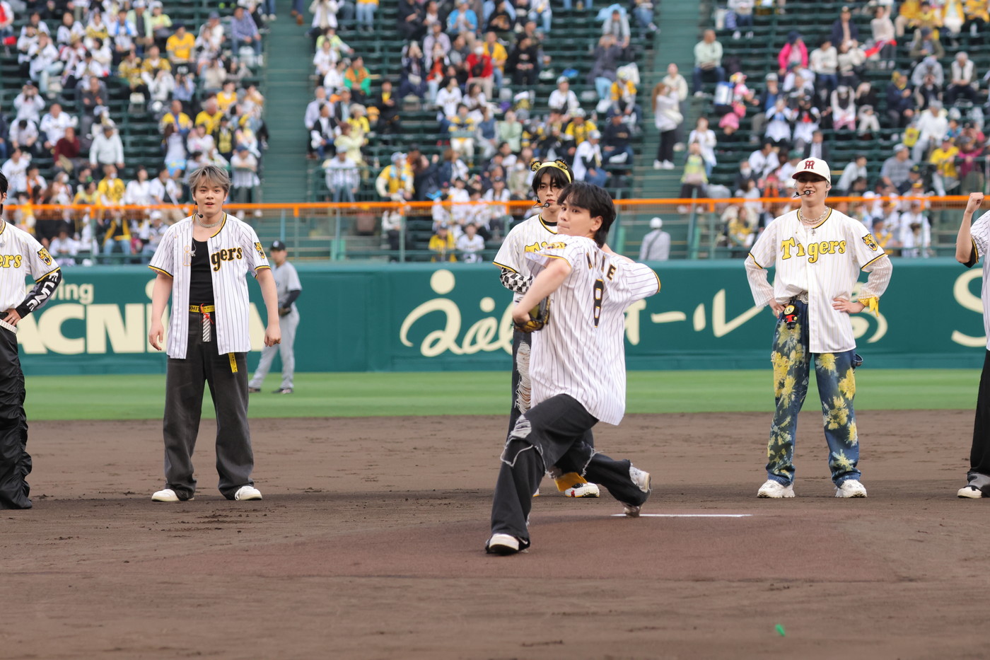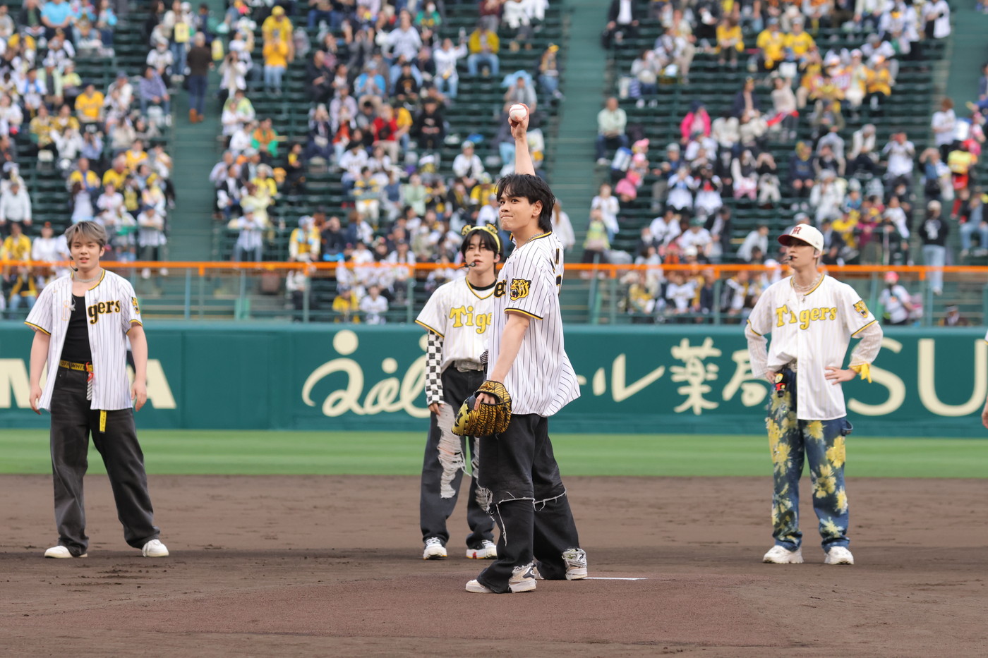 JO1が、4月16日、阪神タイガース対読売ジャイアンツ戦が行われる甲子園球場に登場。“伝統の一戦”の試合前に、新曲「Test Drive」を初パフォーマンスし、そのあとに行われたファーストピッチセレモニーに、メンバーの豆原一成と川西拓実が参加した。