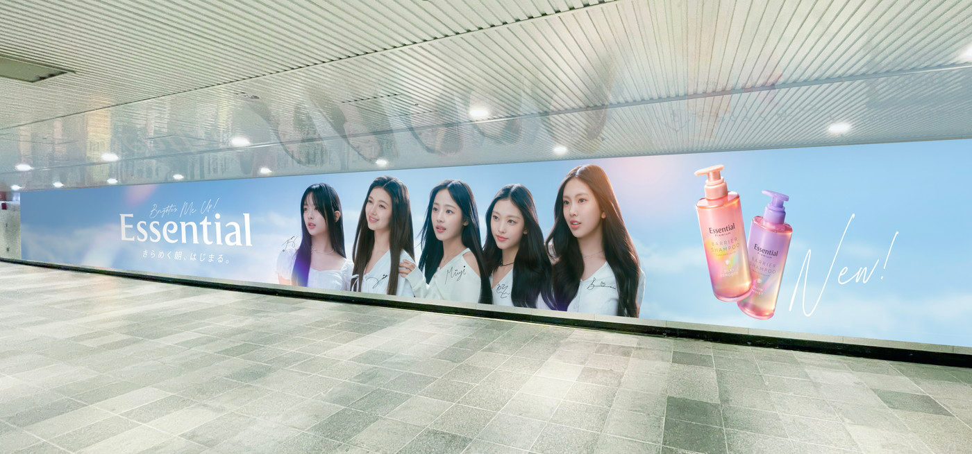 また、4月15日から東急田園都市線 渋谷道玄坂ハッピーボードにて、NewJeansのメンバー5人が揃った爽やかなEssential広告ビジュアルが掲示される他、“Essential Premium”新シャンプー&コンディショナーのサンプルをピールオフ形式で行う。