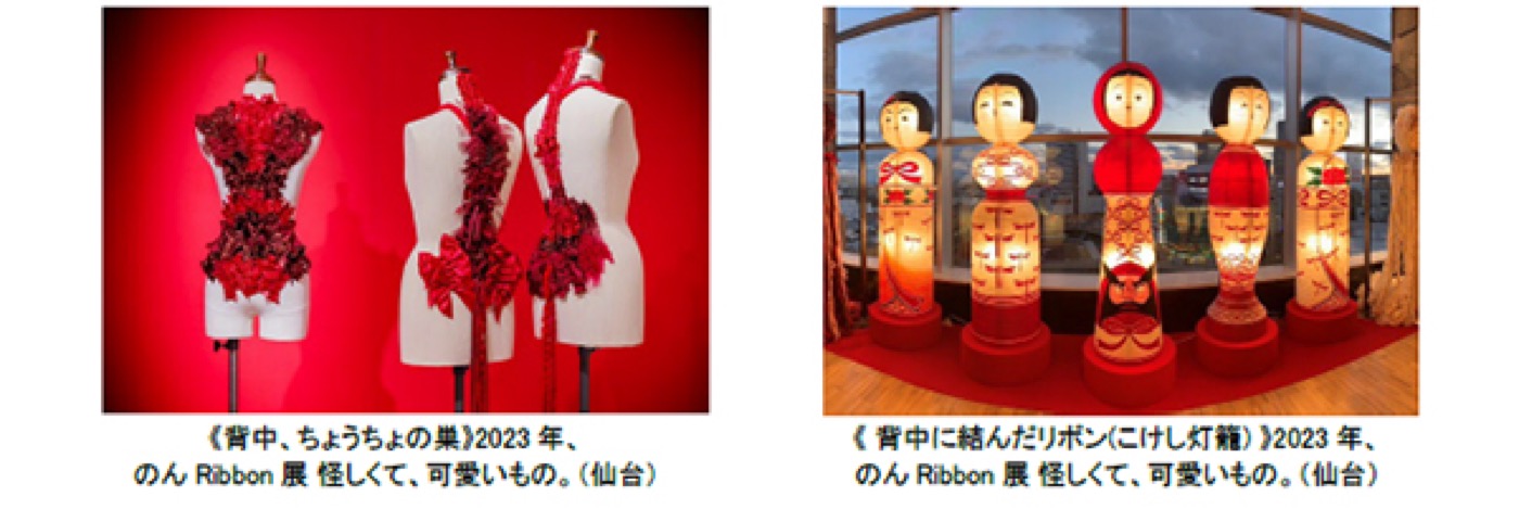 本芸術祭には、のんがこれまで手掛けてきたリボンアートを出展。大量のリボンを使った、不気味さとかわいさがぶつかり合う作風が特徴で、2023年10月に仙台PARCOで発表された、東北の伝統工芸「こけし灯篭」「赤ベコ」にリボンをまとわせた作品も登場する。