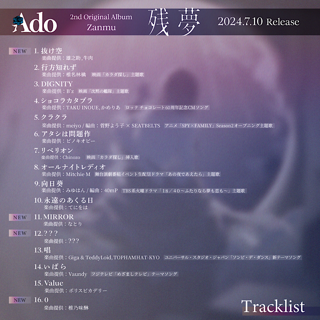 Adoが7月10日にリリースする2nd オリジナルアルバム『残夢』のトラックリストが公開された。