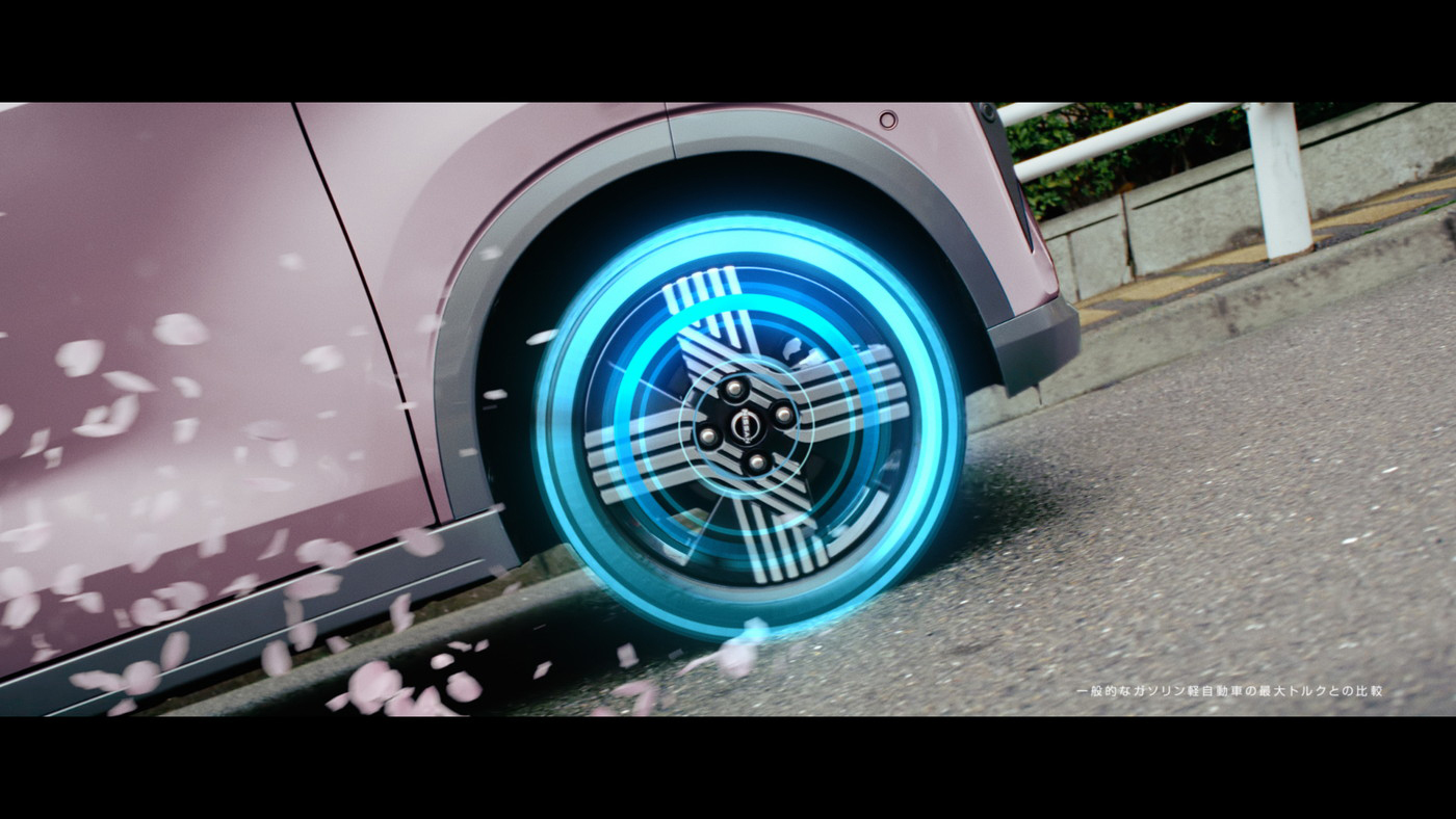 すると歩道には信号待ちをしているゆずのふたりが。目の前を軽快に走り過ぎていく日産サクラを目で追いかけながら、思わずふたりも笑顔に。松もバックミラー越しにふたりを見つけて微笑み、「サクッとね」と笑顔で街中を駆けていく。