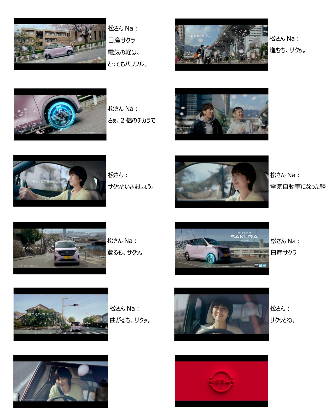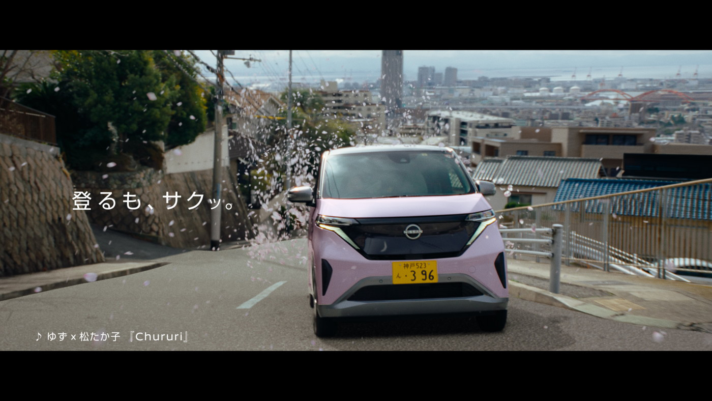 坂道が多いことで知られる街・神戸を舞台に「日産サクラ」を運転する松たか子が、坂道をドライブするシーンからスタート。「サクッといきましょう♪」という掛け声とともに、電気の力で日産サクラが坂道をぐんぐん登る。「登るも、サクッ。曲がるも、サクッ。進むも、サクッ。」という台詞に合わせて、街中を軽快に運転していく松。