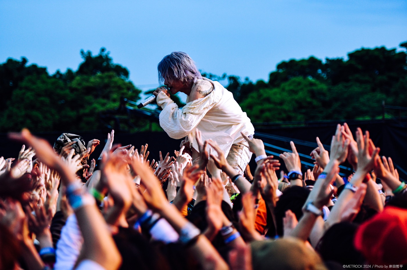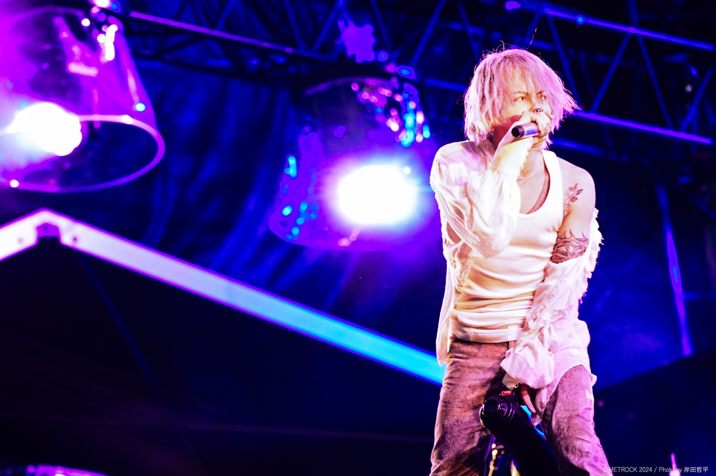 そして18時台のWINDMILL FIELDステージには、5月12日に開催された『メトロック2024』大阪公演が『メトロック』初出演となったHYDEが登場。ステージ上に設置された、高い塔のようなセットの頂点に姿を見せたHYDEは「UNDERWORLD」「MAD QUALIA」と2曲続けて披露。どんどん会場のボルテージが高まっていくなか、ステージを降り、びっしりと会場を埋め尽くしたファンのもとで5曲目「HONEY」を歌唱した。