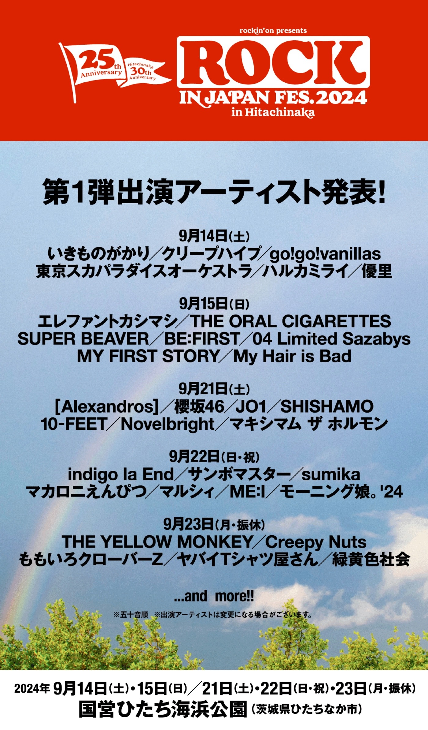 PREV 2024.06.24 『ROCK IN JAPAN FESTIVAL 2024 in HITACHINAKA』第1弾出演アーティスト32組を発表 - 画像一覧(2/2) 前へ 記事に戻る 次へ