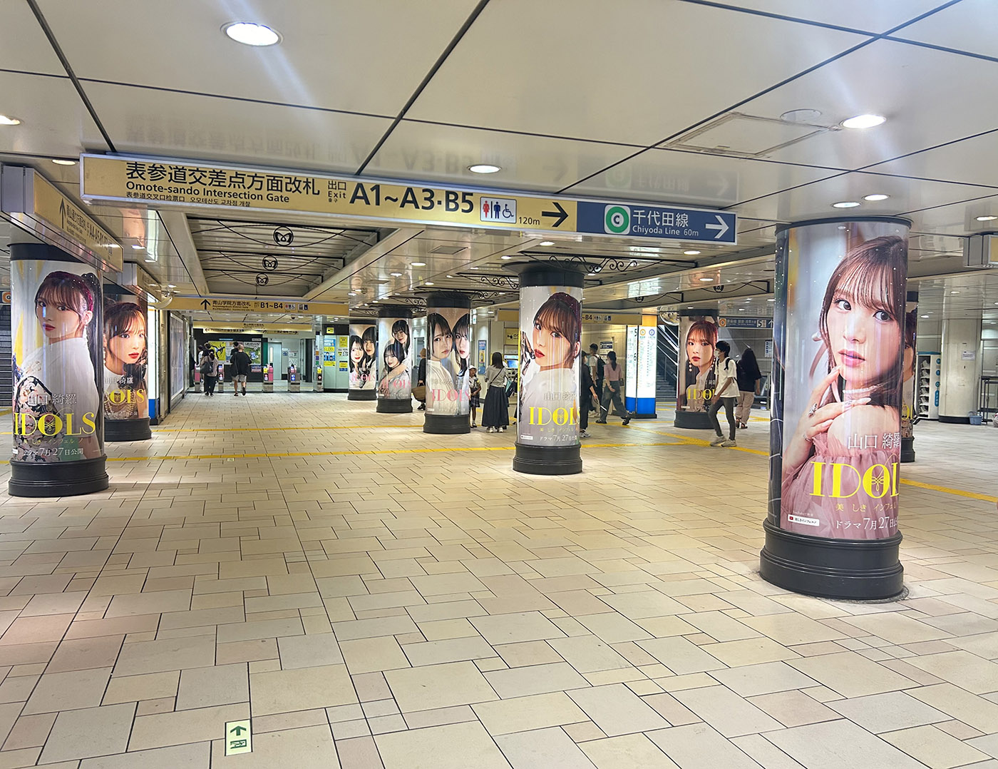 Girls2(2は2乗が正式表記)の山口綺羅、STU48の石田千穂、同じくSTU48の中村舞、HKT48の竹本くるみ、さらにコレオグラファーとして参加している元HKT48の本村碧唯による、グループの垣根を超えた夢のコラボレーションが実現したプロジェクト『IDOLS』の柱巻広告が、東京メトロ表参道駅にて7月22日から28日まで展開される。