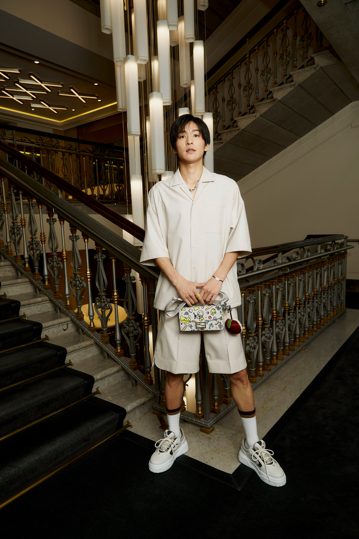 日本人アーティストのタロアウト(tarout)によって、特別に描かれたグラフィックが施された、存在感溢れる“バゲット ソフト トランク”を着用。リンゴモチーフのプレイフルなバッグアクセサリーを添えることで、彼の装いは一層ユニークかつ魅力的なものとなっている。着用アイテムはすべて価格・発売時期ともに未定。