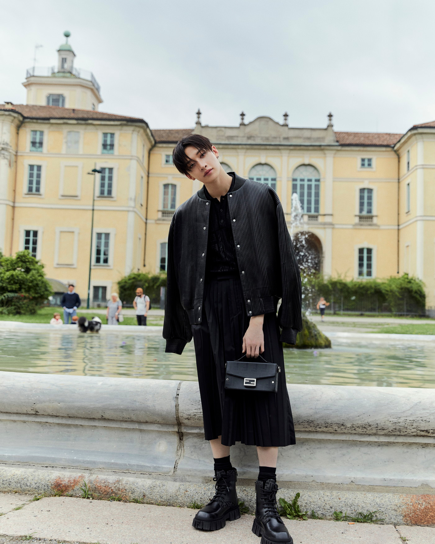 フェンディ 2024-25年秋冬 メンズコレクションより新たに登場する新型の“バゲット ソフト トランク”を着用。柔らかなパディングナッパレザーを使用した、立体感のあるユニークなフォルムが特徴で、日本ではブラックとイエローが9月より発売予定。