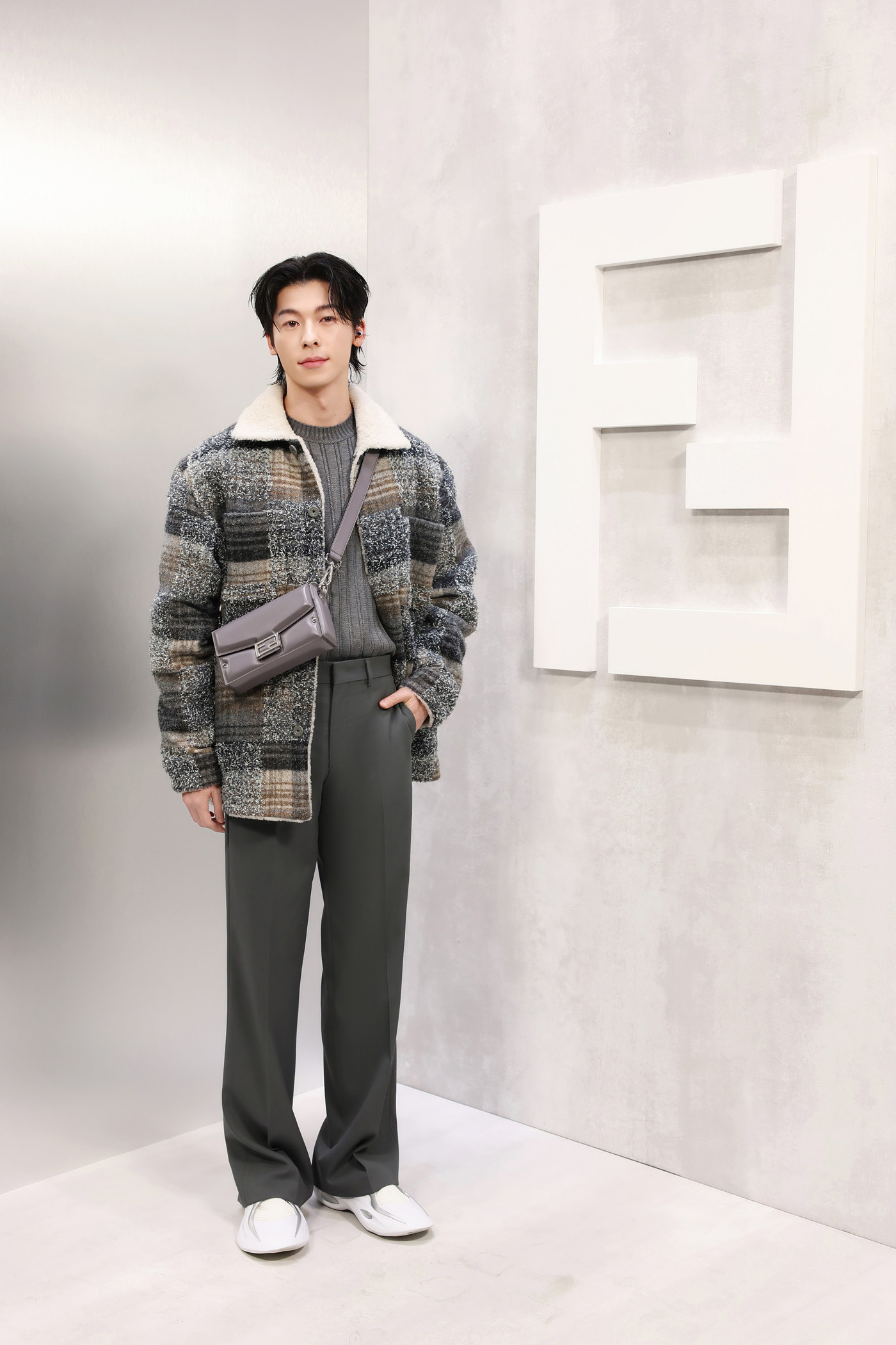 カメリアカラーのグレインレザーを使用した、“セレリア”ラインの“バゲット ソフト トランク”を着用。“フェンディ ファクトリー”のパターンがプリントされており、メゾンの遊び心あふれるクラフツマンシップを体現している。彼のようにスーツに合わせることで、フォーマルな装いにも軽やかさとモダニティを加えることができる。