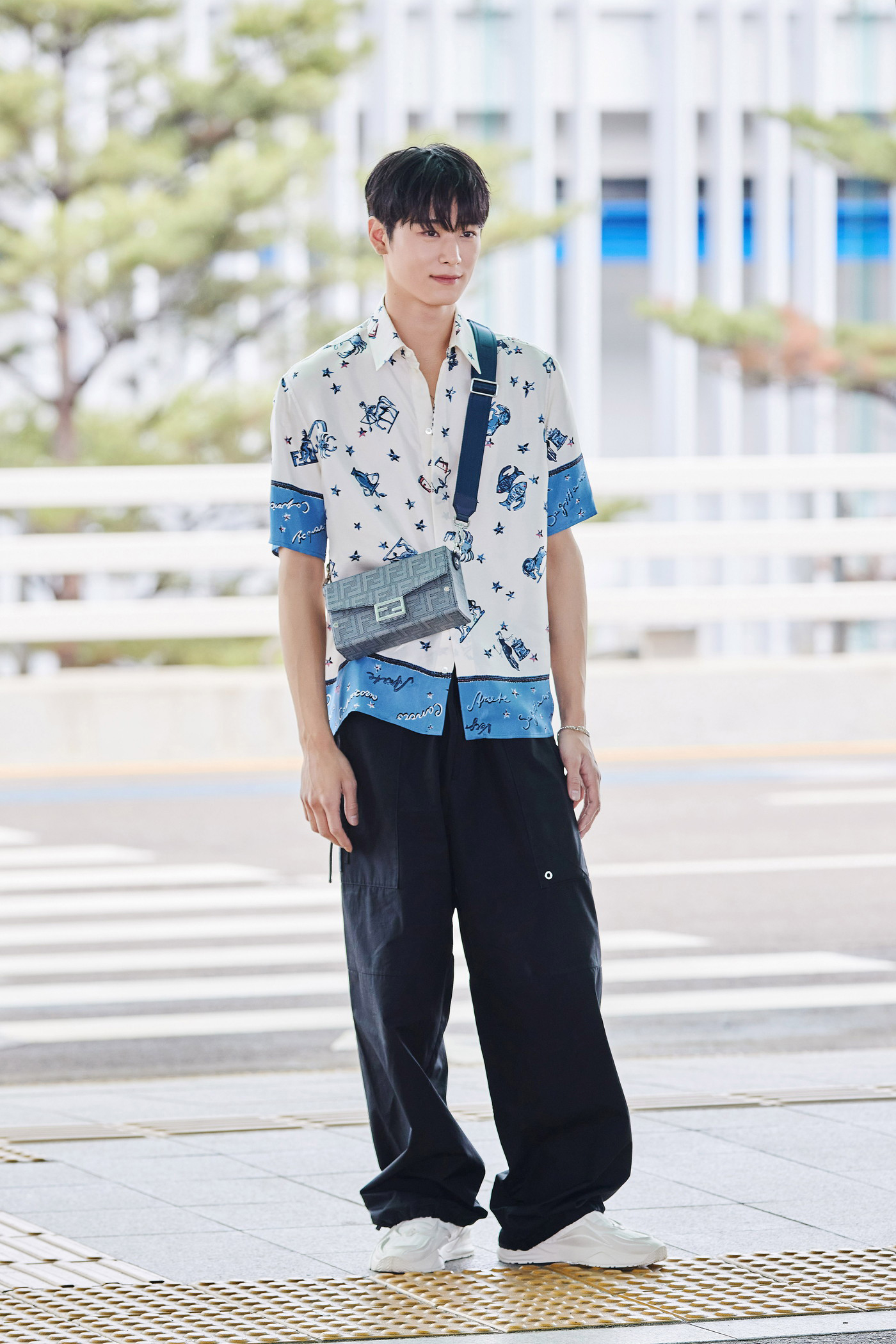 ホワイトとブルーを使用したフェンディ シャドー(Fendi Shadow)レザーに、立体的な“FF”ロゴをあしらった“バゲット ソフト トランク”を着用。彼のようにクロスボディとして着用することで、カジュアルなスタイルも一段と洗練された印象に変わる。
