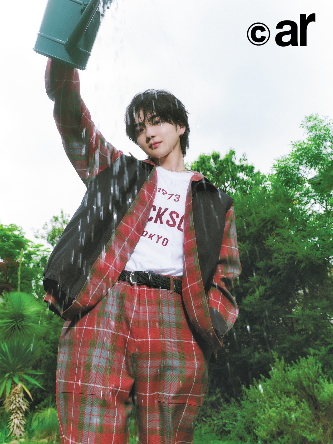 吉野北人の「HOKUTOIRO」では、赤チェックのセットアップを童話の世界の住人のごとく着こなす。「芸能界は華やかで素敵な世界だけど、慣れすぎちゃいけないって思っています」「信頼している人との時間が大切。時には弱さを見せることもあります」と、いつでも自分らしくいるための北人マインドを語った。いつまでも眺められる、ゆったりとした庭での写真も必見だ。