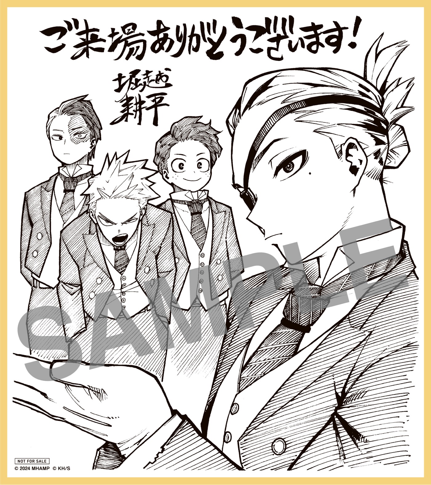 8月17日から全国合計50万名限定で配布される入場者プレゼント第2弾は、原作者・堀越耕平先生描き下ろしの複製ミニ色紙。描かれているのは、主人公の緑谷出久(通称“デク”)とクラスメイトの爆豪勝己と轟焦凍、そして本作公開後、人気急上昇中の劇場版オリジナルキャラクターであるジュリオ。執事であるジュリオだけでなく、デク・爆豪・轟もぴっちりと七三分けにヘアセットをして執事姿となっており、ここでしか手に入らない特別な複製ミニ色紙となっている。ジュリオと本作ならではのレアな3人のビジュアルの入場者プレゼントをぜひ劇場でゲットしよう。
