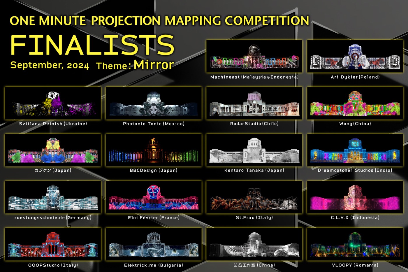 2012年から始まった世界的にも歴史と権威ある、日本発のプロジェクションマッピング国際大会。毎年1分から1分59秒の映像で世界一が競われ、本年度は「Mirror:鏡」をテーマに、世界56の国または地域から278組ものエントリーが寄せられた。そのうちファイナリストに選出された、世界14ヵ国から18作品と新進気鋭のクリエイターが集結。聖徳記念絵画館を舞台に賞金200万と世界一の称号をかけた頂上決戦が開催される。