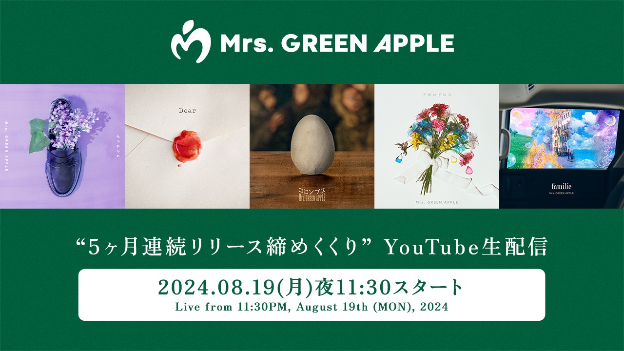 Mrs. GREEN APPLE “5ヶ月連続リリース締めくくり” YouTube生配信 ※8月19日23時30分公開予定