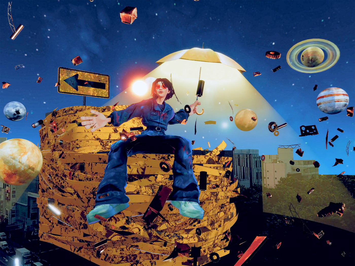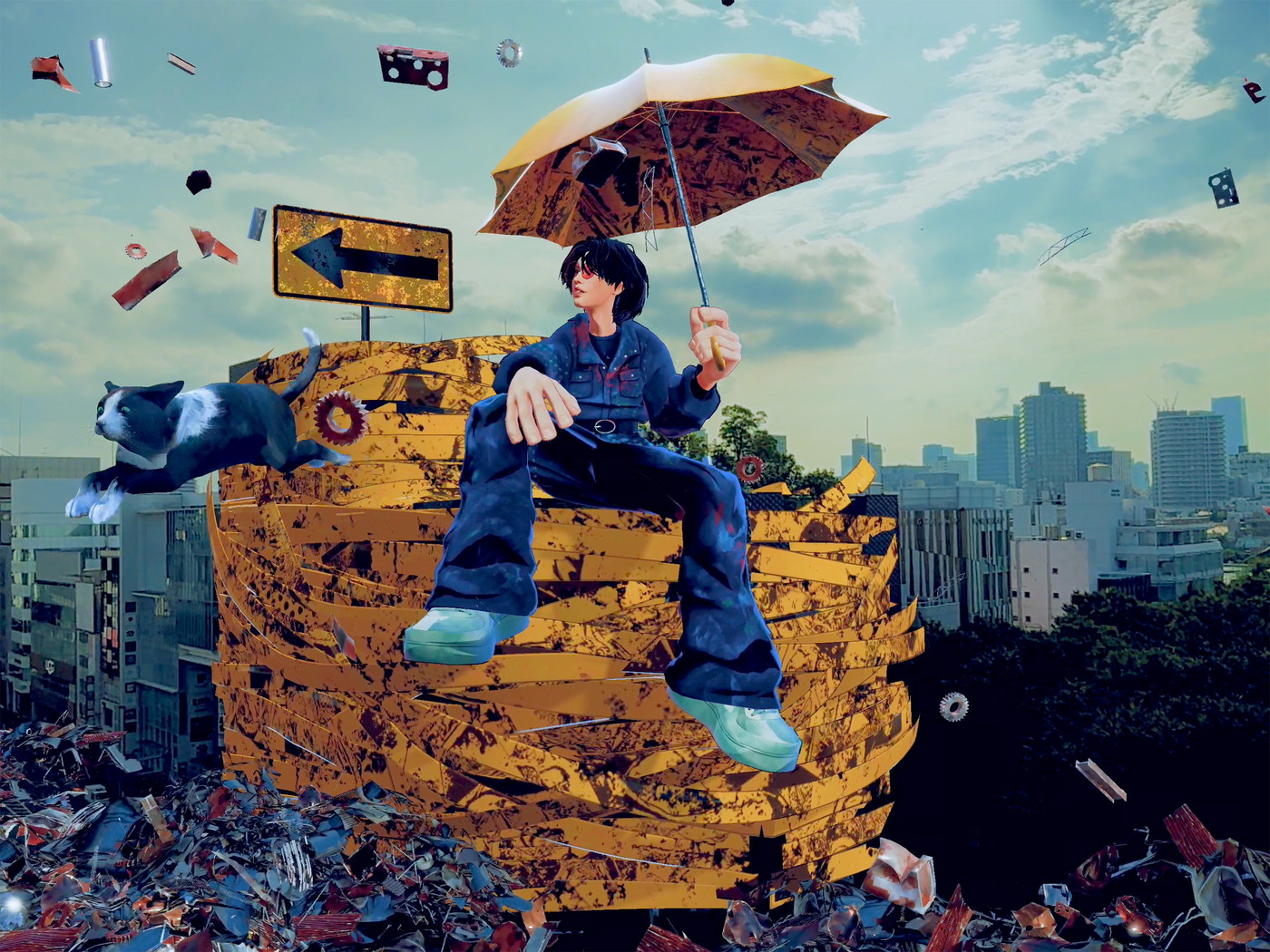 砂煙を上げながら暴れまわった米津は、ラフォーレ原宿から傘を抜き取り、オモカドに腰掛けると、がらくたの雨が降るなかで「毎日」を歌う。すると黄色いテープでラッピングされたオモカドのうえで気持ちよさそうに歌う米津を中心に7つの惑星が周回。歌詞とリンクした通知が現れるニクい演出に目を奪われている間にがらくたの雨は止み、上空を1羽のツバメが飛んでいく。