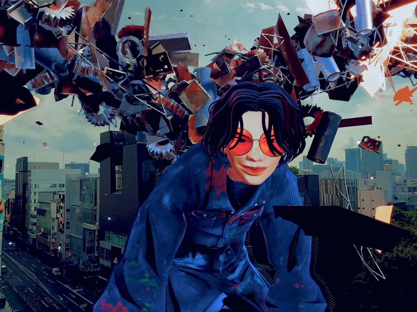「こちらは廃品回収車です。~壊れていても構いません」という、米津が「がらくた」を制作するきっかけになったと語る、あのアナウンスが流れるなか、突如車がぶつかったような衝突音が鳴り響くと、巨大な米津が空からがらくたの塊に目掛けて落下し原宿の交差点に現れる。縦横無尽に原宿の交差点を動き回りながら「KICK BACK」を歌う巨大な米津。