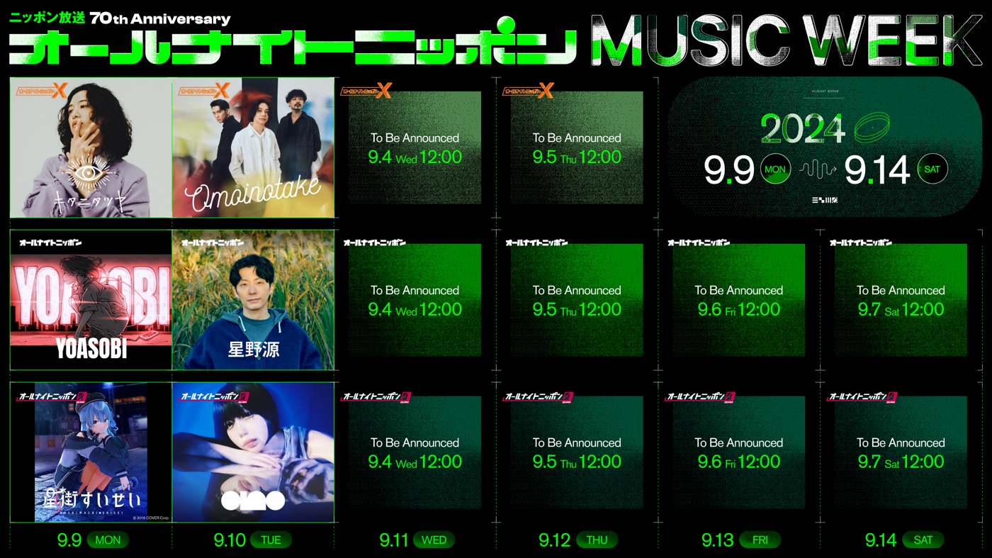 2024年7月にニッポン放送が開局70周年を迎えたことを記念し、2年ぶりに開催される『オールナイトニッポン MUSIC WEEK』。9月9日から14日の一週間、深夜25時からの『オールナイトニッポン』と深夜24時からの『オールナイトニッポンX(クロス)』、深夜27時からの『オールナイトニッポン0(ZERO)』の3ブランドすべての番組のパーソナリティを、アーティストが担当する。