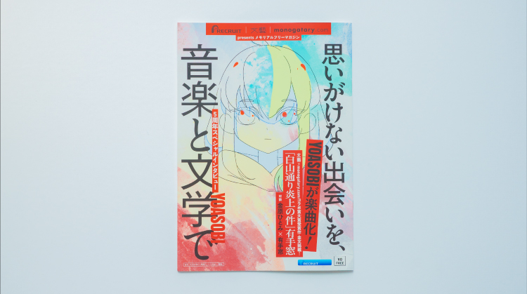 YOASOBIを生んだ小説投稿サイト「monogatary.com」と、河出書房新社発行の文芸誌『文藝』がコラボした小説コンテストの大賞受賞作品『白山通り炎上の件』の全文と、まもなく結成5周年を迎えるYOASOBIの独占インタビューを掲載した『メモリアルフリーマガジン』が、9月2日より東京、神奈川、埼玉、千葉、大阪、愛知、北海道、宮城、広島、福岡の駅などに設置されているリクルートフリーペーパーラックで順次、無料配布される。