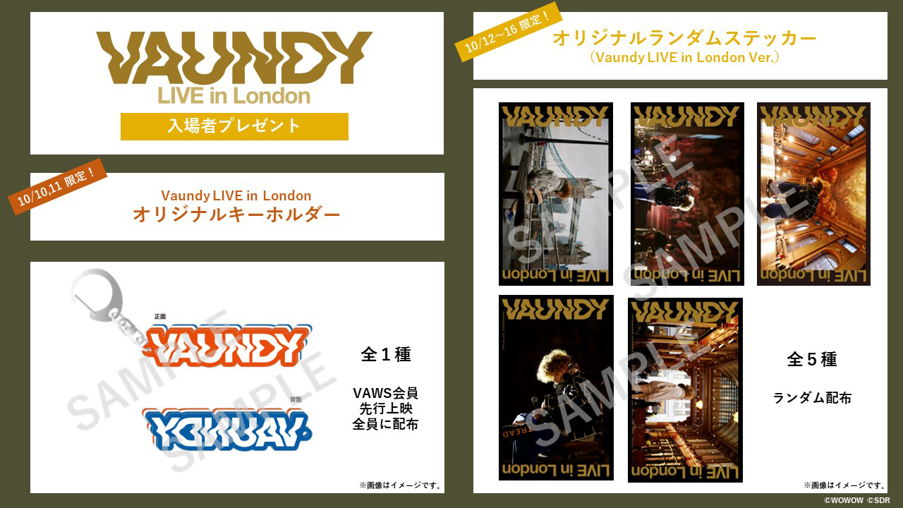 入場者特典として10月10・11日は「Vaundy LIVE in London オリジナルキーホルダー」、10月12日から10月16日はオリジナルランダムステッカー(Vaundy LIVE in London ver)が配布されることも決定した。