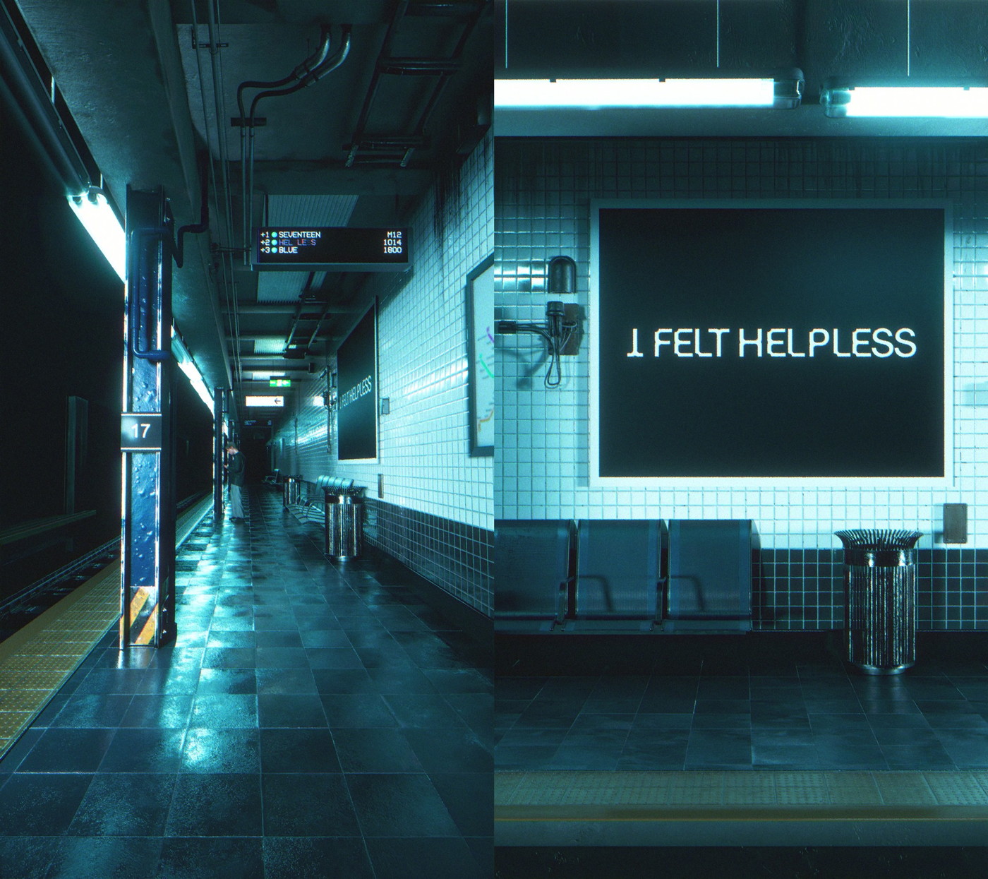 ■ティザー映像では、壁面広告板に書かれた“IFELTHELPLESS(私は無力感を感じた)”という字句が目を引く