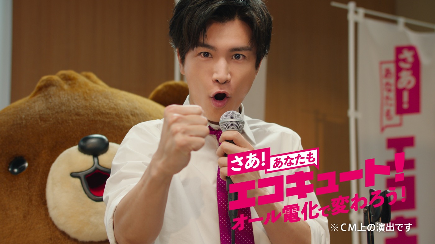 新TVCMで岩田は、エコキュートの普及を推進する“エコキュー党”の党首を演じている。