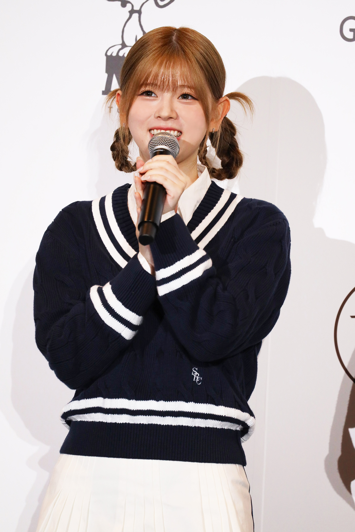 スヌーピーがプレゼンターをつとめるなか、用意されたボタンを押すとスクリーンにPEANUTSとNiziUのコラボレーション「PEANUTS Fun Times With NiziU」のテーマが込められたキービジュアルが披露された。