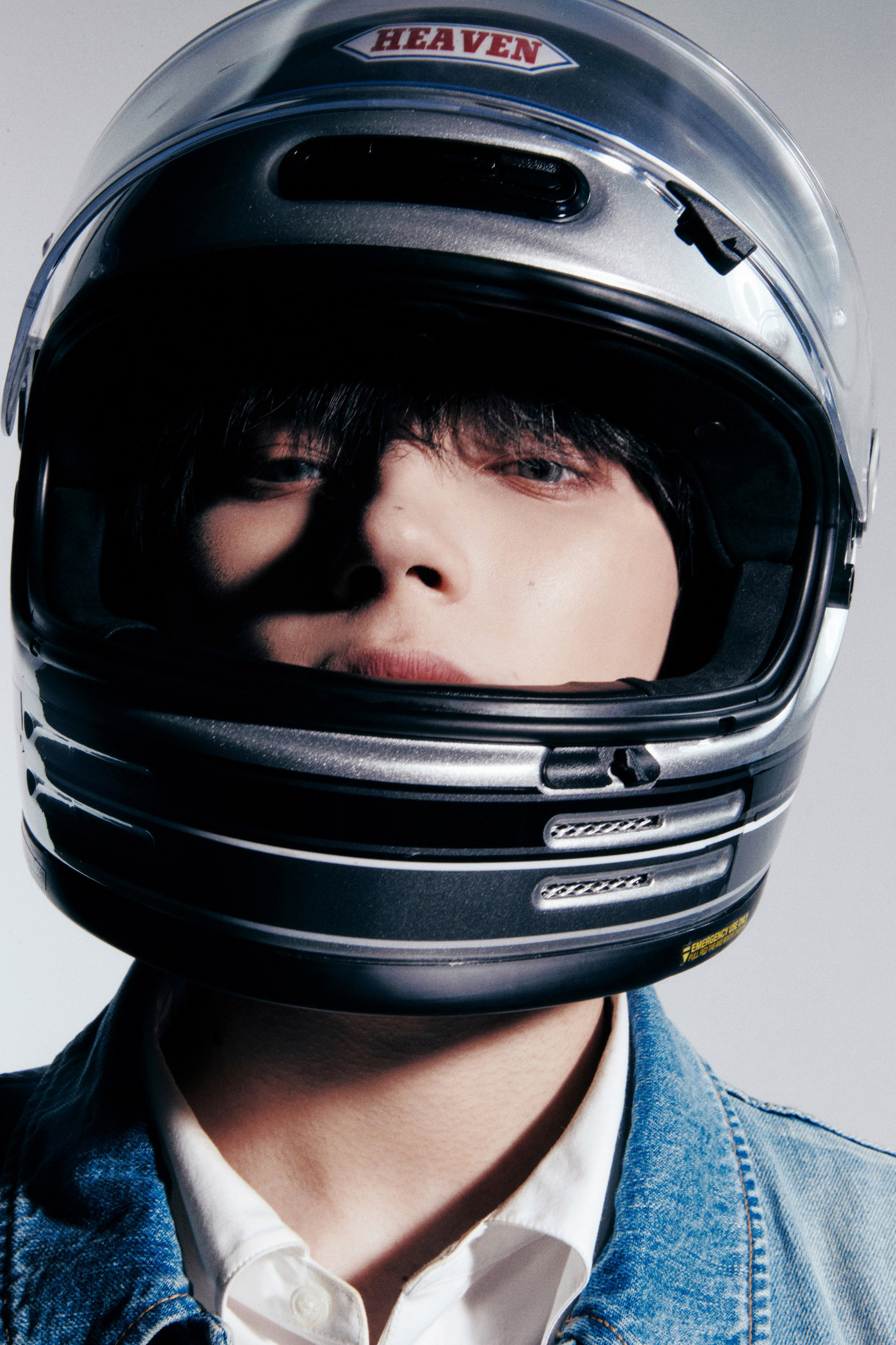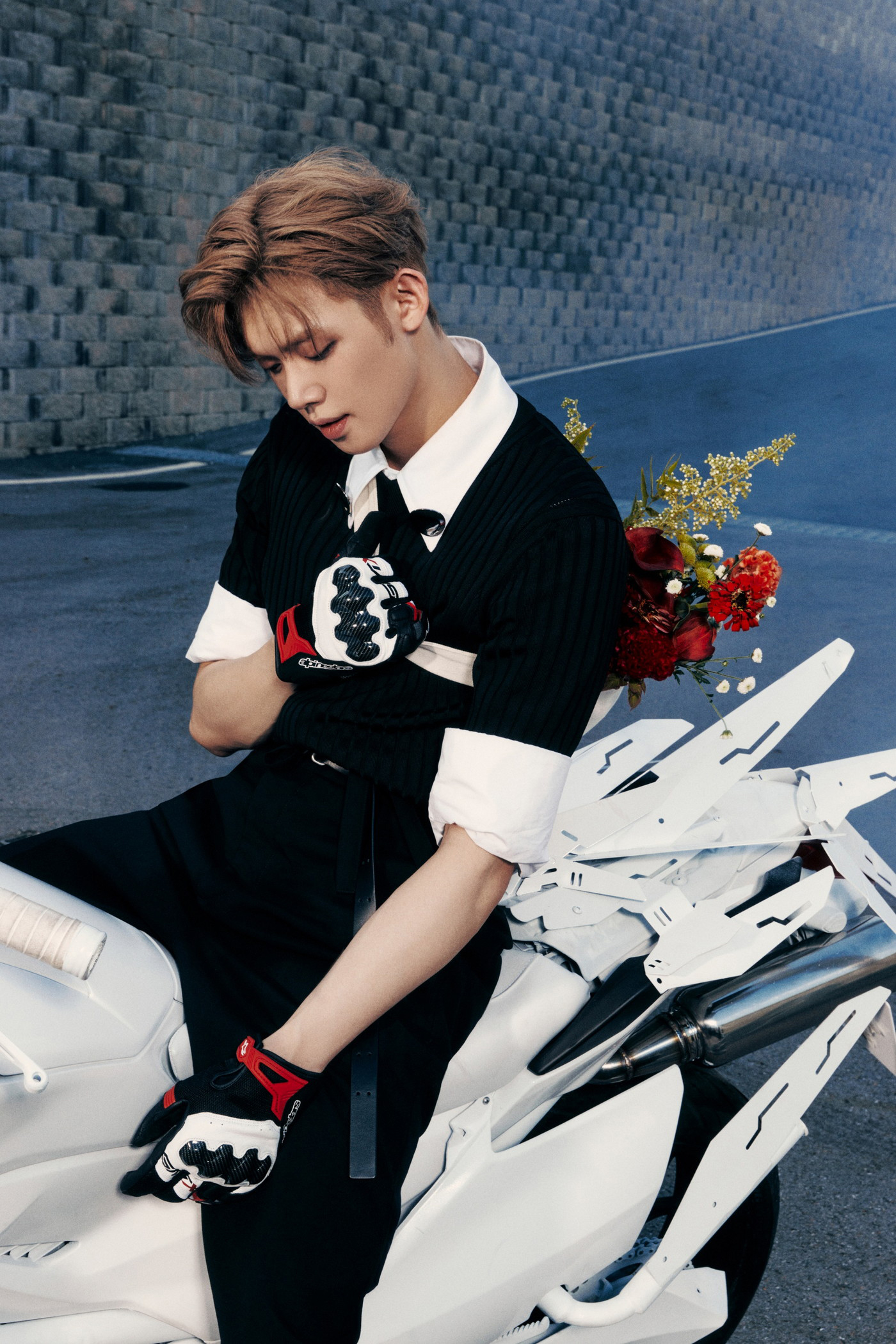 コンセプトフォトのTOMORROW X TOGETHERの眼差しは強く、バイクについたベールとブーケが見る人たちの想像力を刺激する。