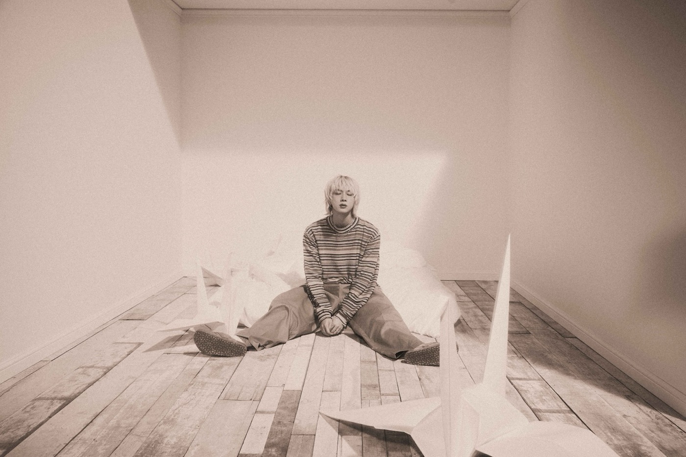 今回の写真では、背景に温かさが感じられる寝室があり、パジャマを着たJINが、真っ白な寝具とともにリラックスした雰囲気を演出している。寝室には折り鶴、星型の大きなオブジェが様々な大きさで飾られており、想像力をかきたてる。