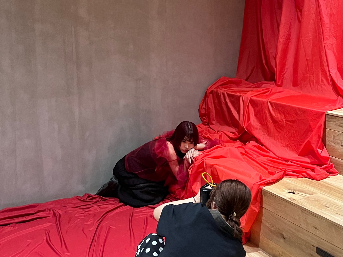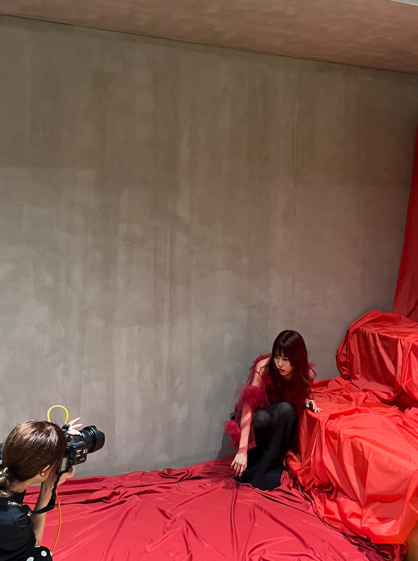 撮影中は、カメラのシャッターとともに次々と表情とポージングを変えるアイナ・ジ・エンド。指先まで可憐に美しく、自由自在に自身を表現する姿に、目が離せない。世界観に引き込まれ、彼女の表現力の素晴らしさを感じられる撮影となった。