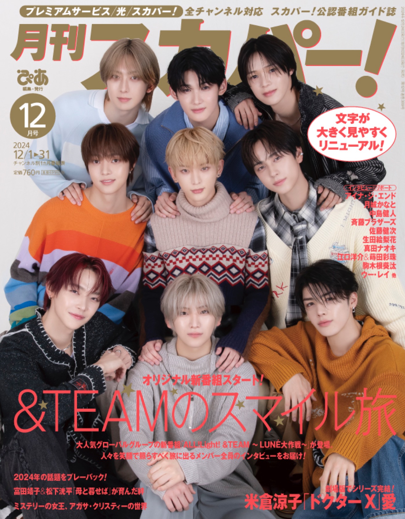 12月号の表紙(両面W表紙)を飾るのは、冠バラエティー番組『ALL!Light! &TEAM ~LUNE大作戦~』がスタートする&TEAM。番組に関するインタビューを実施し、ステージで見せる姿とは異なる、仲良く和気あいあいとした彼らの素顔が紹介される。