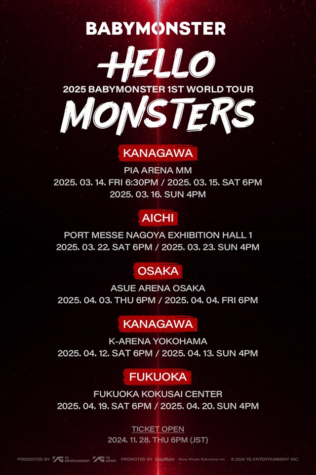 また初のワールドツアー『2025 BABYMONSTER 1st WORLD TOUR <HELLO, MONSTERS> IN JAPAN』のチケット先行予約も11月28日にスタート。詳しい情報はBABYMONSTER JAPANオフィシャルサイトまで。