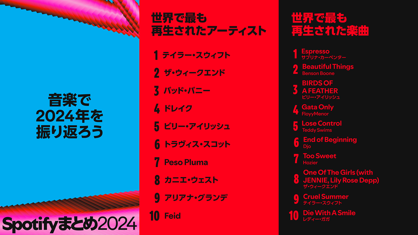 PREV NEXT 2024.12.05 Spotify年間ランキング発表!Creepy Nuts「Bling-Bang-Bang-Born」が日本&海外で最も再生された国内アーティスト楽曲に - 画像一覧(4/7) 前へ 記事に戻る 次へ