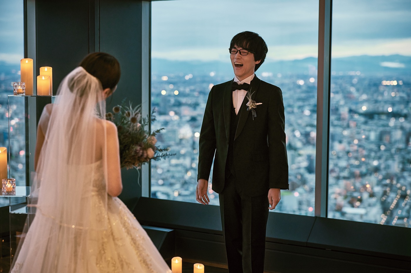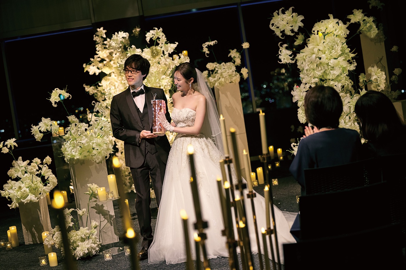 挙式はまだ外の明るい夕方の時間帯から実施。キャンドルや花で装飾された都庁展望室に親族らを招待し、ドレスアップしたふたりのファーストミートや誓いの言葉代わりの手紙の交換、ランタンセレモニーなどのプログラムを行った。