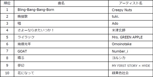PREV NEXT 2024.12.06 ビルボードジャパン2024年年間チャート発表!総合ソング首位はCreepy Nuts「Bling-Bang-Bang-Born」 - 画像一覧(8/18) 前へ 記事に戻る 次へ