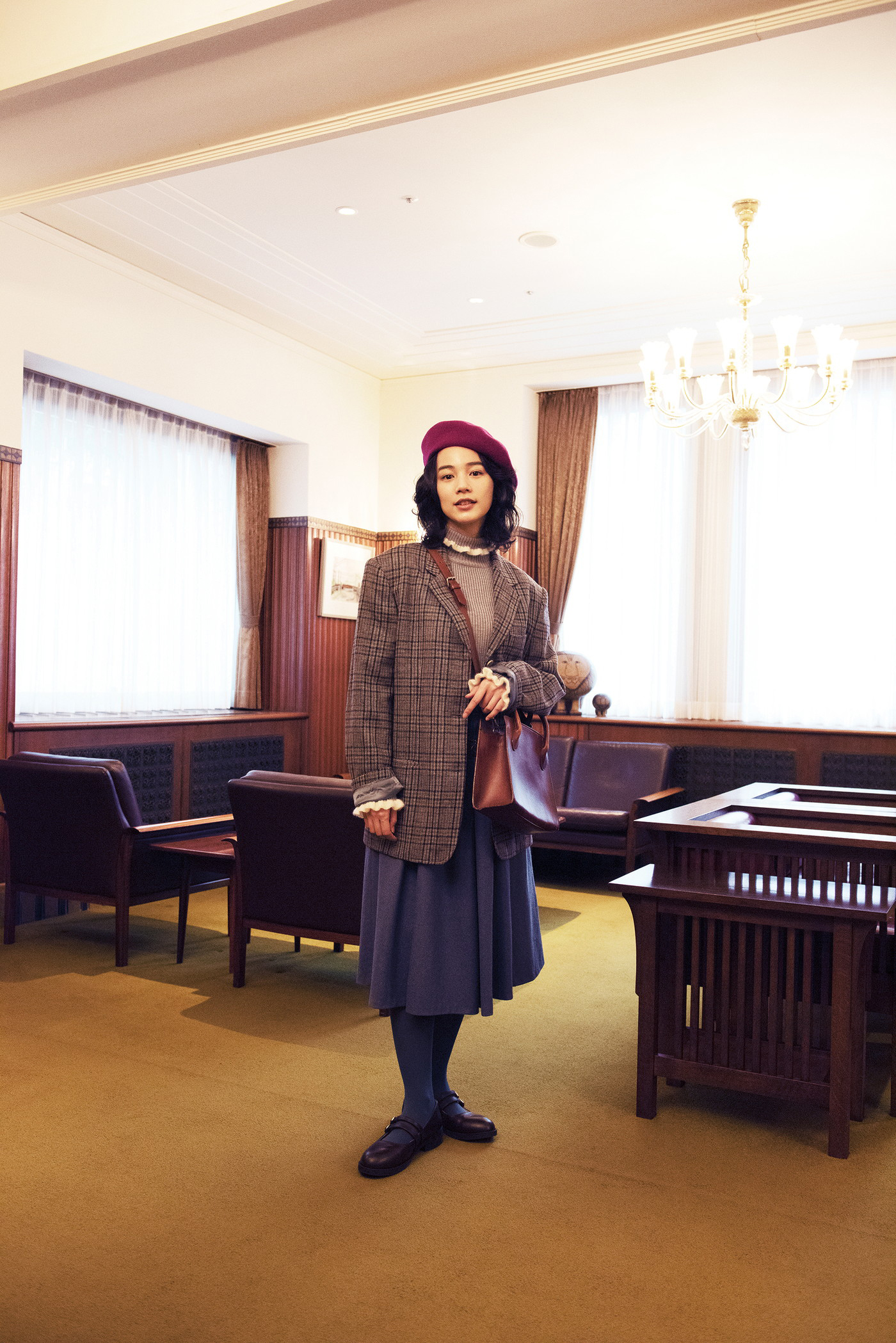2枚目は加代子が山の上ホテルに宿泊したときのスタイリング。80年代を彷彿とさせるトラッドな要素と落ち着いた色味が印象的だ。ブラウン系のチェック柄ジャケットを主役に、フリルのあるハイネックトップスでフェミニンさを加え、ブルーのフレアスカートが全体を軽やかにまとめている。さらに、鮮やかな赤いベレー帽がアクセントとなり、ノスタルジックな雰囲気を醸し出している。