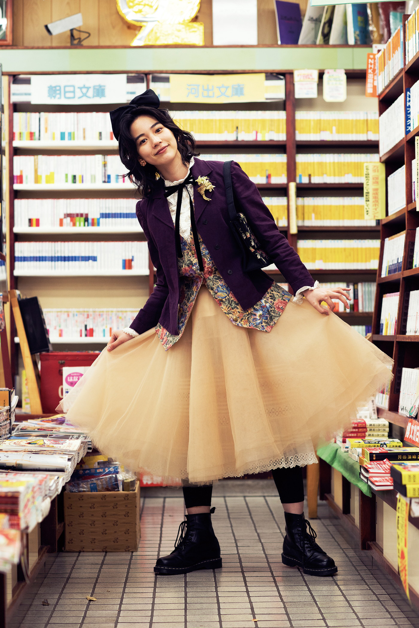 3つ目は加代子が書店に自著を売り込みに訪れる時ときのスタイリング。パープルのジャケットに鮮やかな花柄のベストを組み合わせ、全体にヴィンテージ感のある雰囲気が漂う。ボトムスにはボリューム感のあるベージュのチュールスカートを取り入れ、フェミニンさと軽やかさを加えたスタイリングとなっている。レトロな要素と現代的なアレンジが絶妙に調和し、加代子の個性が現れている。