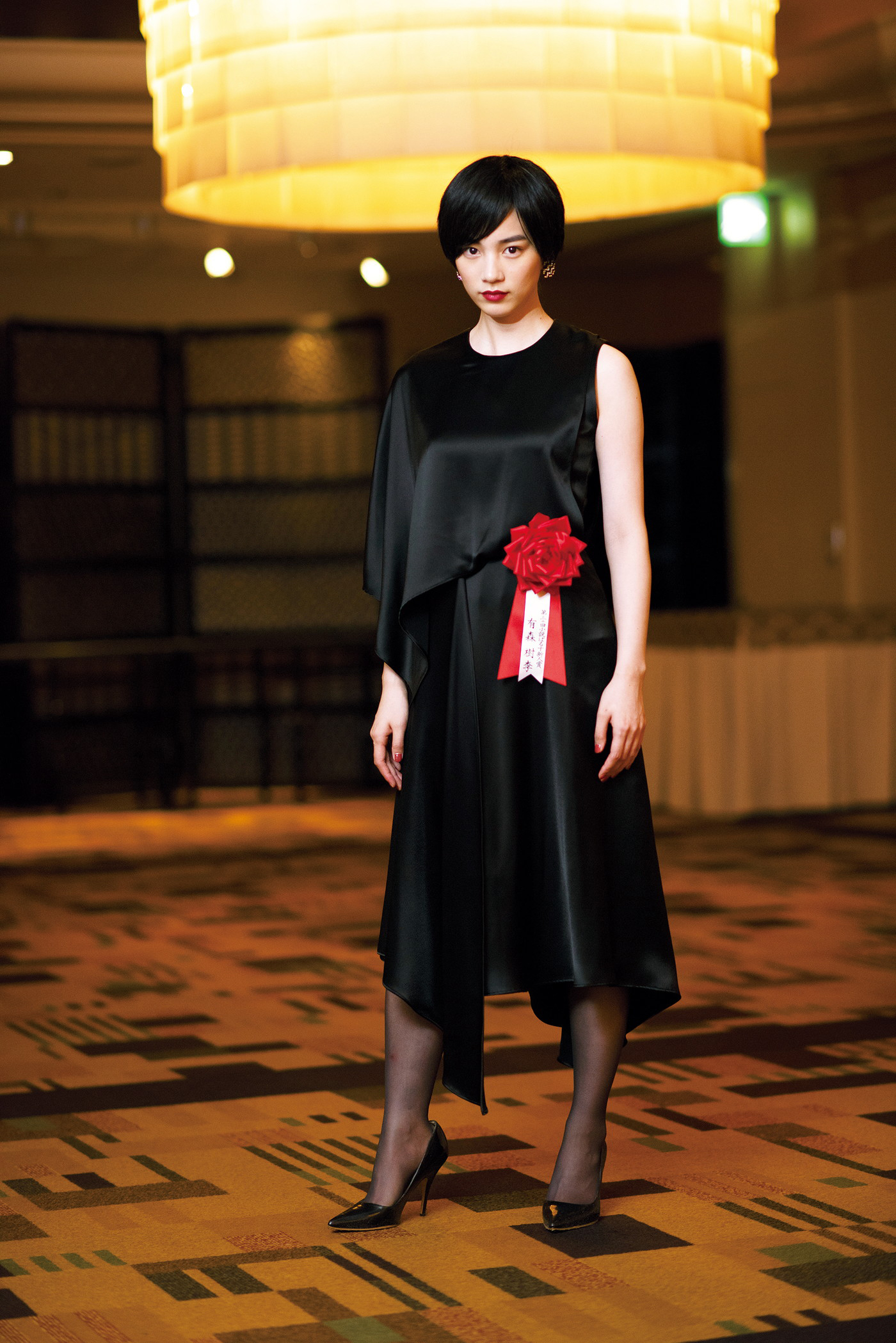 4枚目は加代子がペンネームを変え、有森樹里として新人賞を受賞した際のスタイリング。これまでの雰囲気とは一変し、ショートヘアに艶やかなブラックのアシンメトリードレスを纏い、上品さと大人っぽさが際立つ装いとなっている。足元にはブーツやストラップシューズではなくヒールを合わせており、今までとは違った雰囲気を感じるスタイリングとなっている。