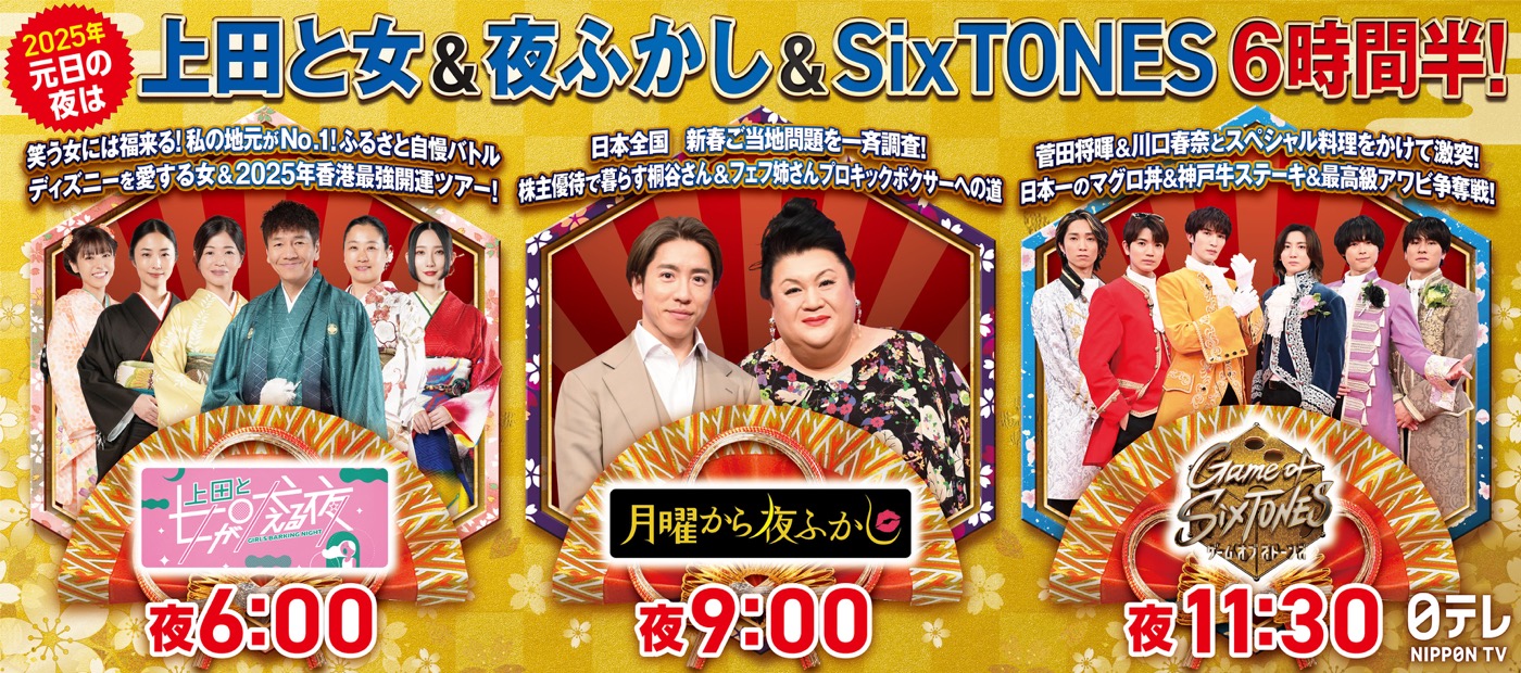 日本テレビにて、2025年1月1日18時より『上田と女が吠える夜』『月曜から夜ふかし』『Game of SixTONES』元日SPが6時間半にわたって放送される。