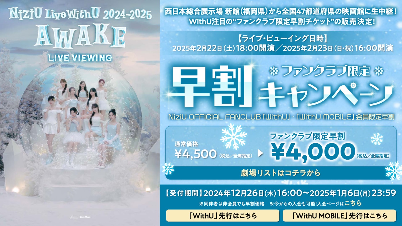 NiziUのコンサートツアー『NiziU Live with U 2024-2025 “AWAKE”』において、2025年2月22日・23日に福岡・西日本総合展示場 新館にて行われる公演の模様が、全国47都道府県の映画館でライブビューイングされることが決定した。