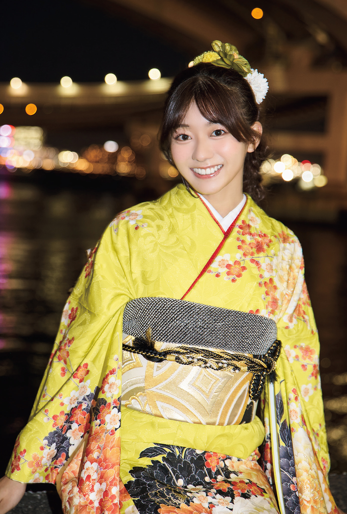 3月1日に東京体育館で『≒JOY 3rd ANNIVERSARY PREMIUM CONCERT』を開催する≒JOYから、大信田美月が登場。夜のレインボーブリッジを背景に、グループカラーである黄色の振袖姿を鮮やかに切り取った。