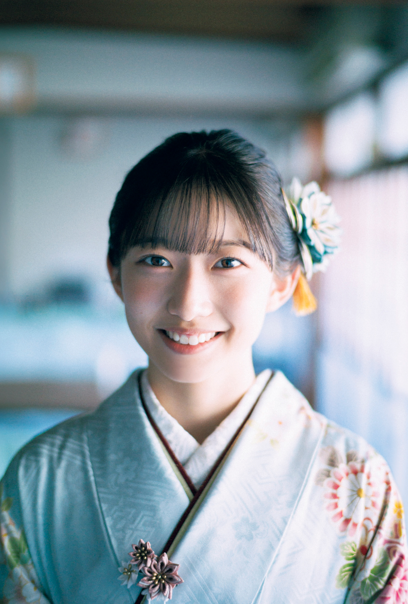 そして20歳を迎えた今年、晴れて研究生から正規メンバーに昇格、今後さらに飛躍が期待される彼女を上品さ際立つ洋館スタジオにて撮影。なんとなくAKBらしさも感じられるような小洒落た柄の振袖を着用してもらい、二十歳を迎えた現在の佐藤の晴れ姿を切り取った。