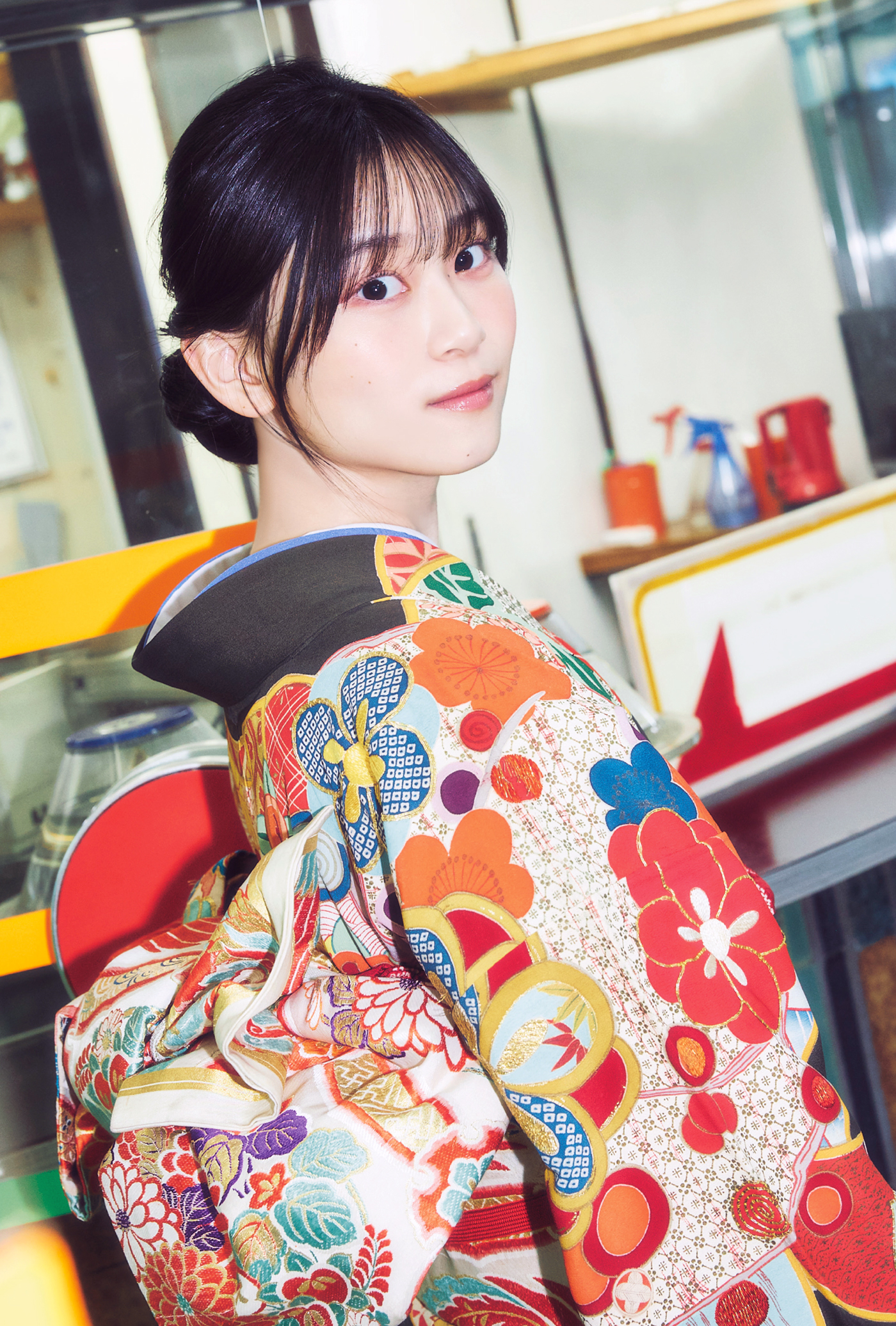 そんな山下の振袖姿をレトロな映画館で撮り下ろし。100年物の色鮮やかな振袖に身を包んだ彼女の凛々しさを切り取った。裏表紙には澄んだ瞳でこちらを見つめるカットを採用。