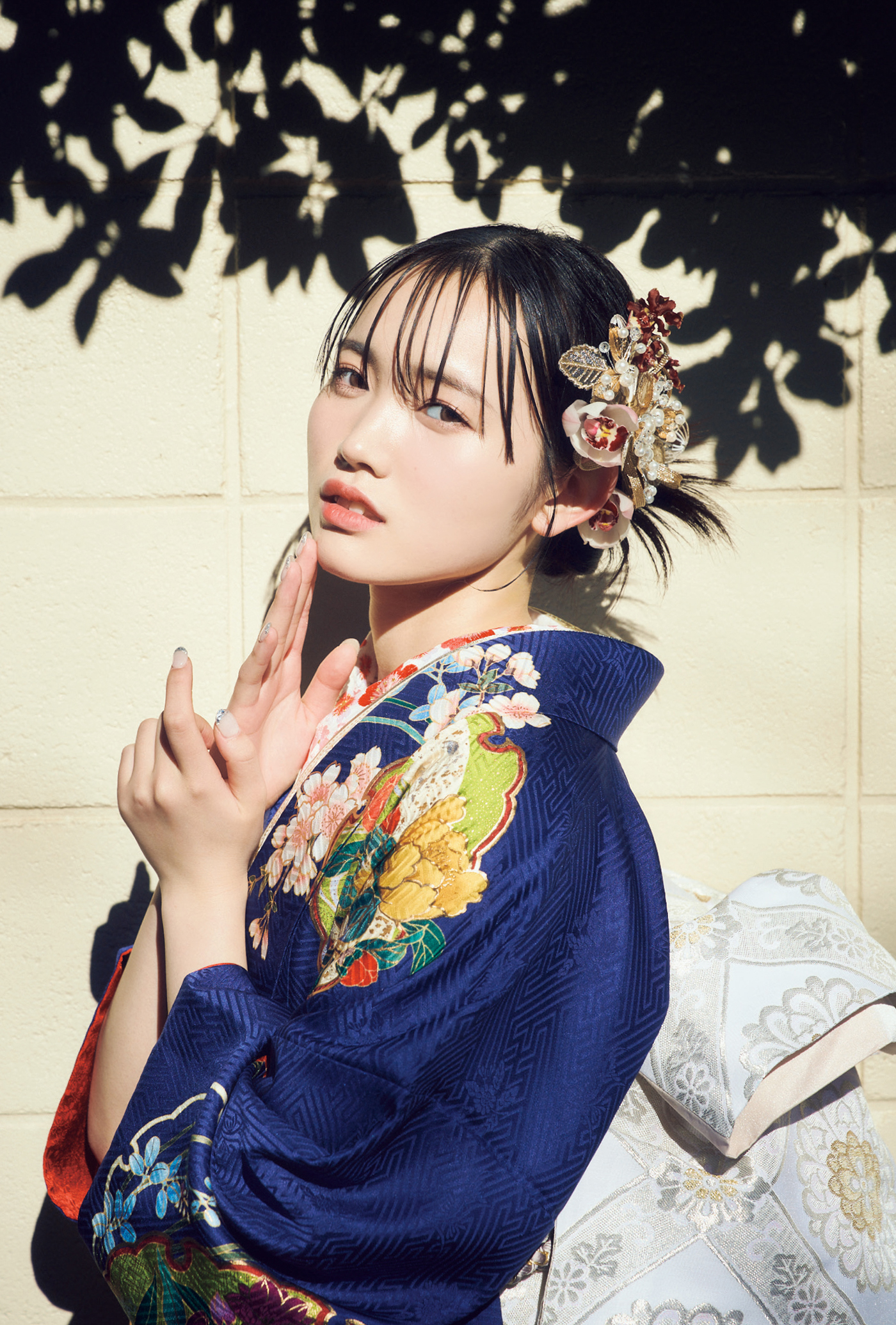 12月25・26日に『Happy Magical Tour 2024』東京ドーム公演を開催した日向坂46から、四期生の小西夏菜実が登場。振袖衣装は紅葉が美しいのどかな公園で撮影。白を基調とした振袖をまとった小西の、思わず見とれてしまうような美しさをカメラに収めた。