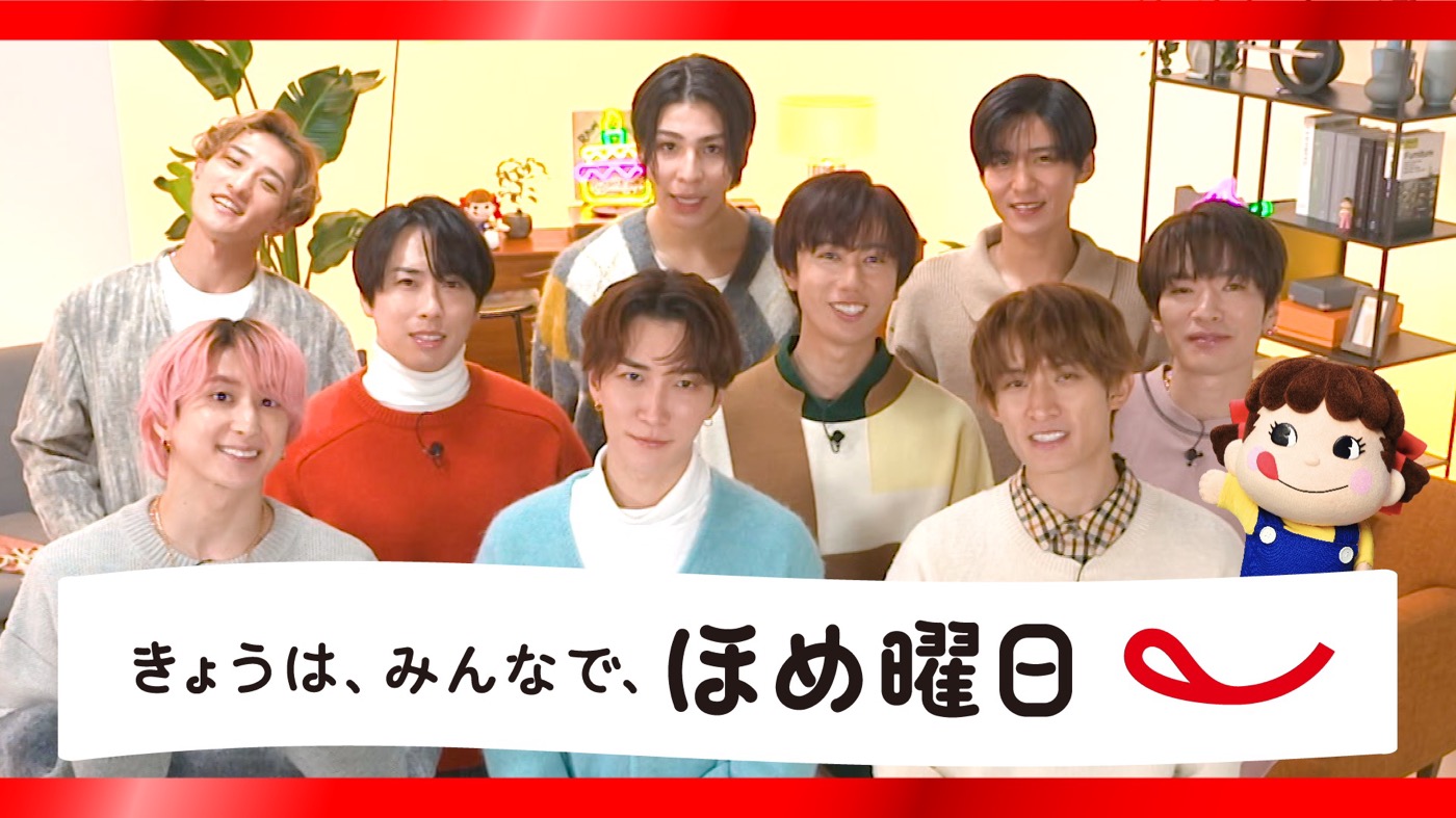 また、新CMのオンエア開始にあわせて、1月22日より不二家洋菓子店公式YouTubeチャンネルではWebムービーを公開。Snow Manが、CMのテーマ「ほめ曜日」にちなみ、CMにも登場する“ほめペコ”になりきって、いつも頑張っているメンバーに褒め言葉を贈る企画「Snow Manのきょうは、みんなで、ほめ曜日」にチャレンジしている。CMとはひと味違った9人の魅力溢れるWebムービーにも注目だ。